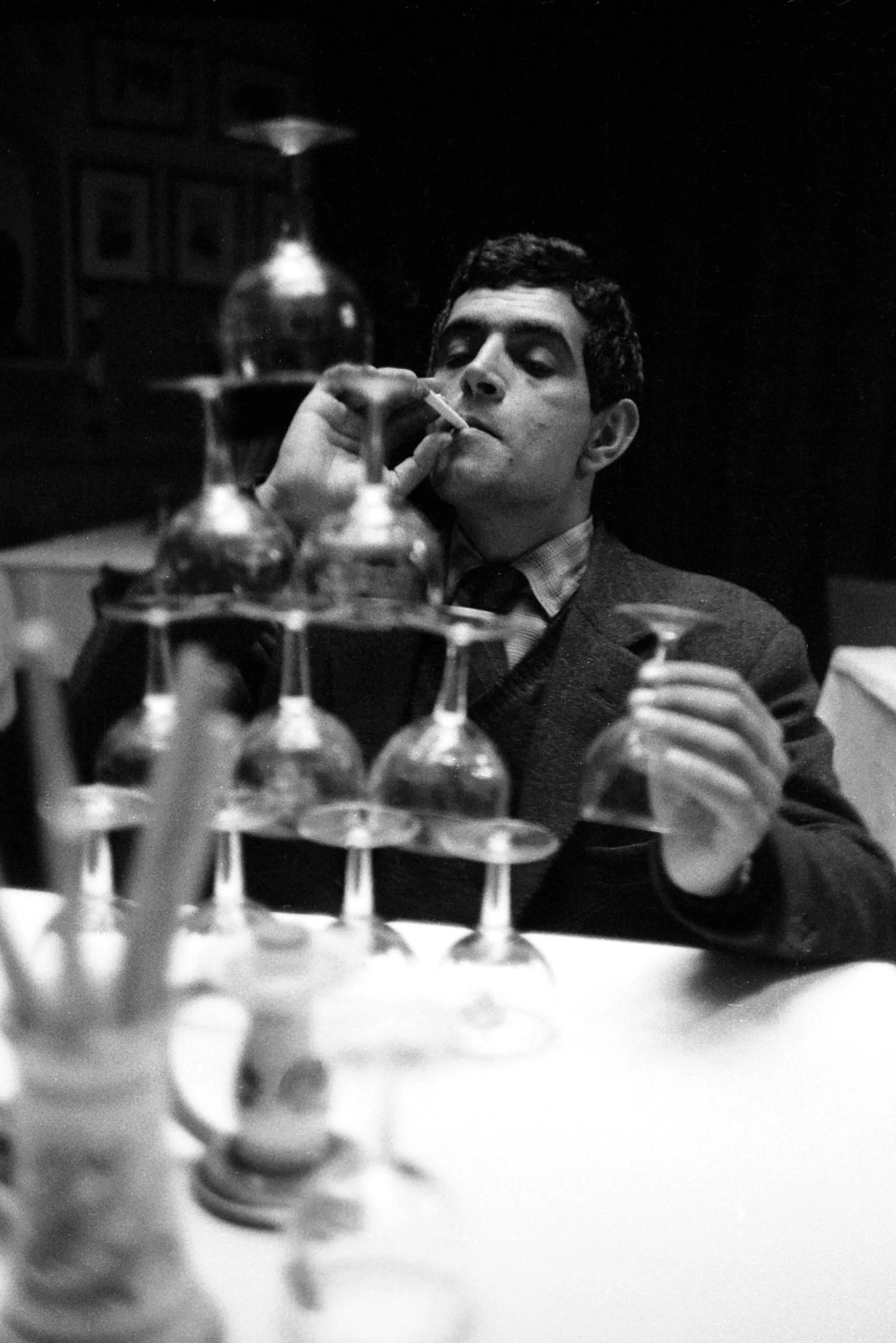 Black and white photograph of a man at a table, cigarette at his lips, holding a coupe glass beside a pyramid of stacked stemware