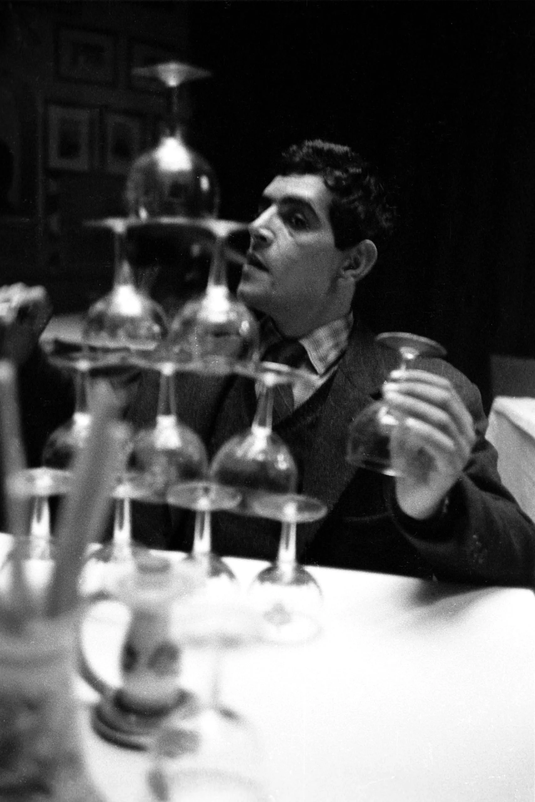 Black and white photograph of a young man holding a wine glass beside a pyramid of stacked stemware on a white-draped table, head tilted back, dramatically lit from above