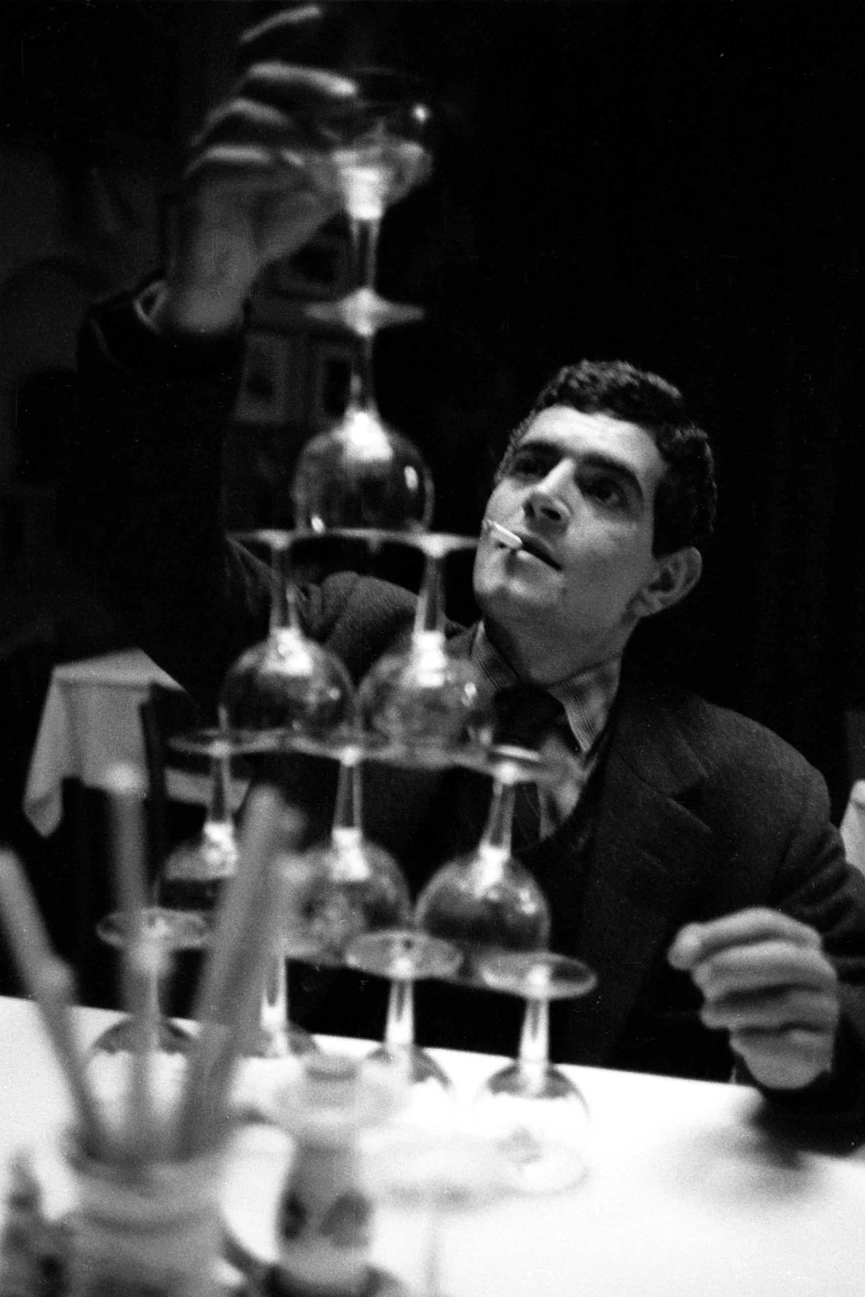Black and white photograph of a man with a cigarette in his lips leaning over a table, examining a pyramid of stacked stemmed glasses
