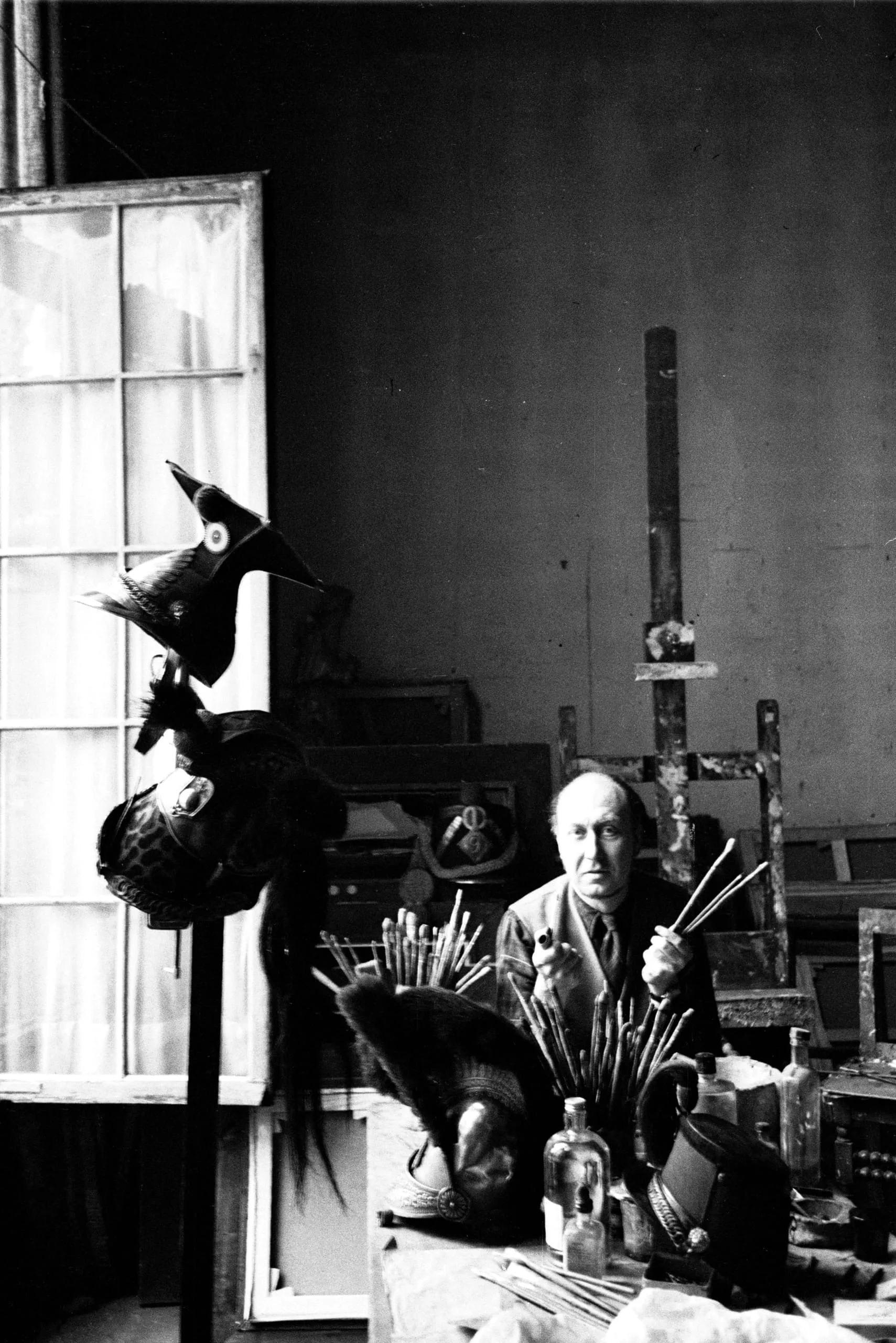 Black and white photograph of a white man seated at a cluttered artist's studio table, holding paintbrushes, with a dark sculptural bird-like form on a stand in the foreground