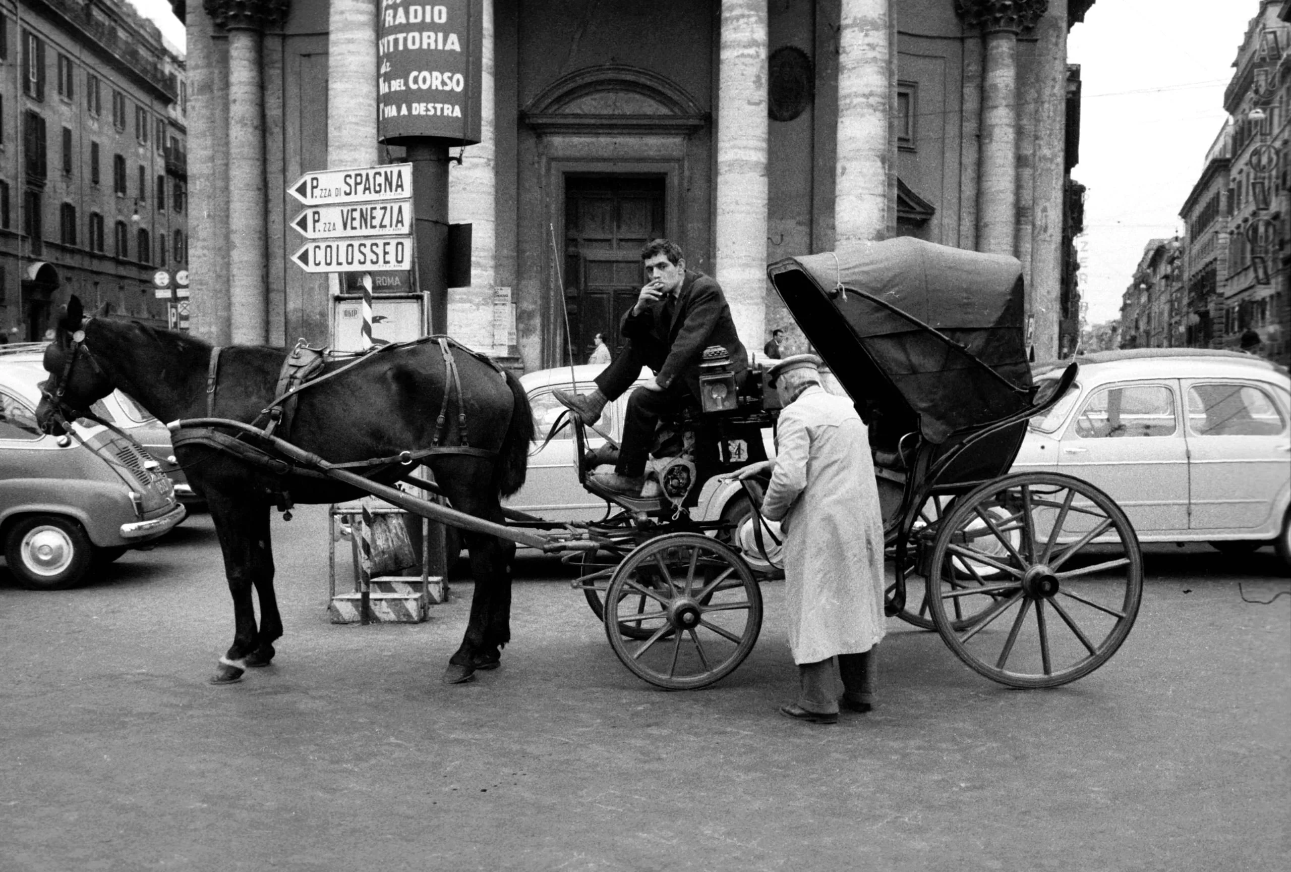 Black and white photograph of a horse-drawn carriage stopped in a Roman piazza, with a man seated on the driver's bench and another standing beside it, directional signs and classical columns visible behind