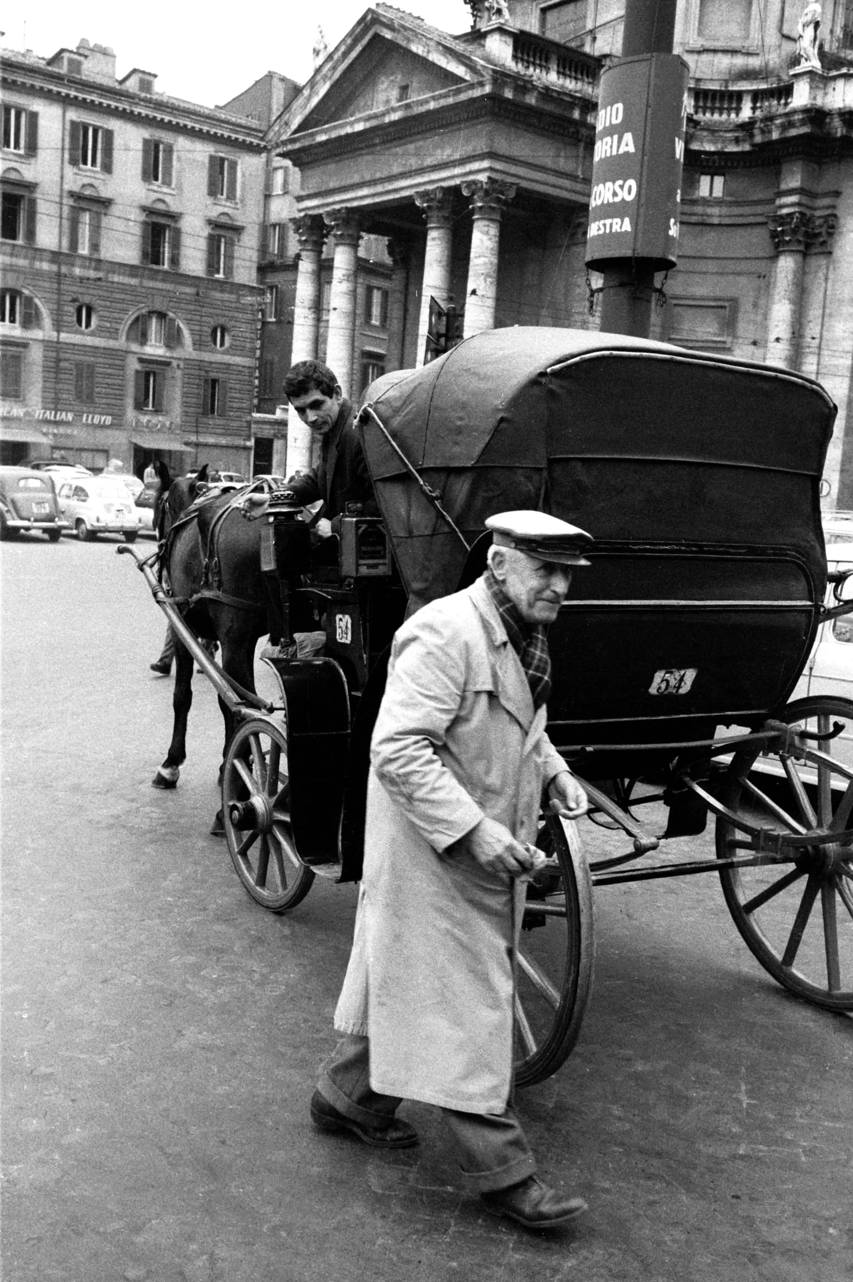 Black and white photograph of an older man gripping a carriage wheel on a city square, with a younger man seated on the driver's bench above a harnessed horse, neoclassical buildings in the distance