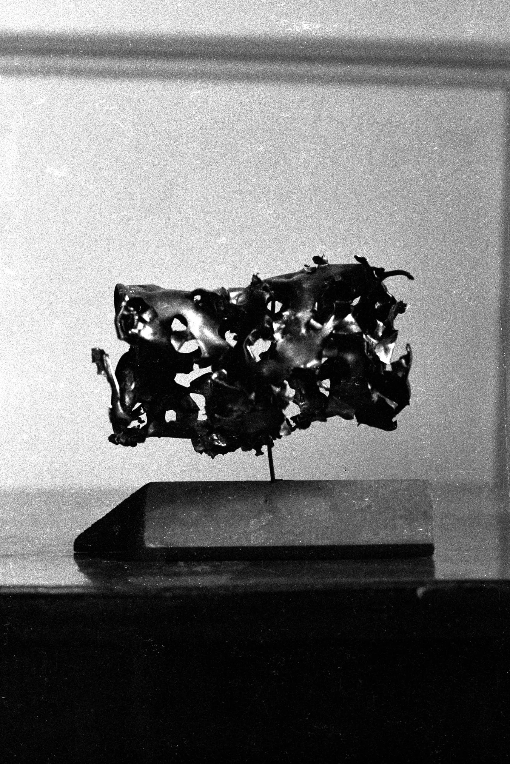 Black and white photograph of a small abstract metal sculpture with jagged, perforated forms mounted on a thin rod over a flat rectangular base
