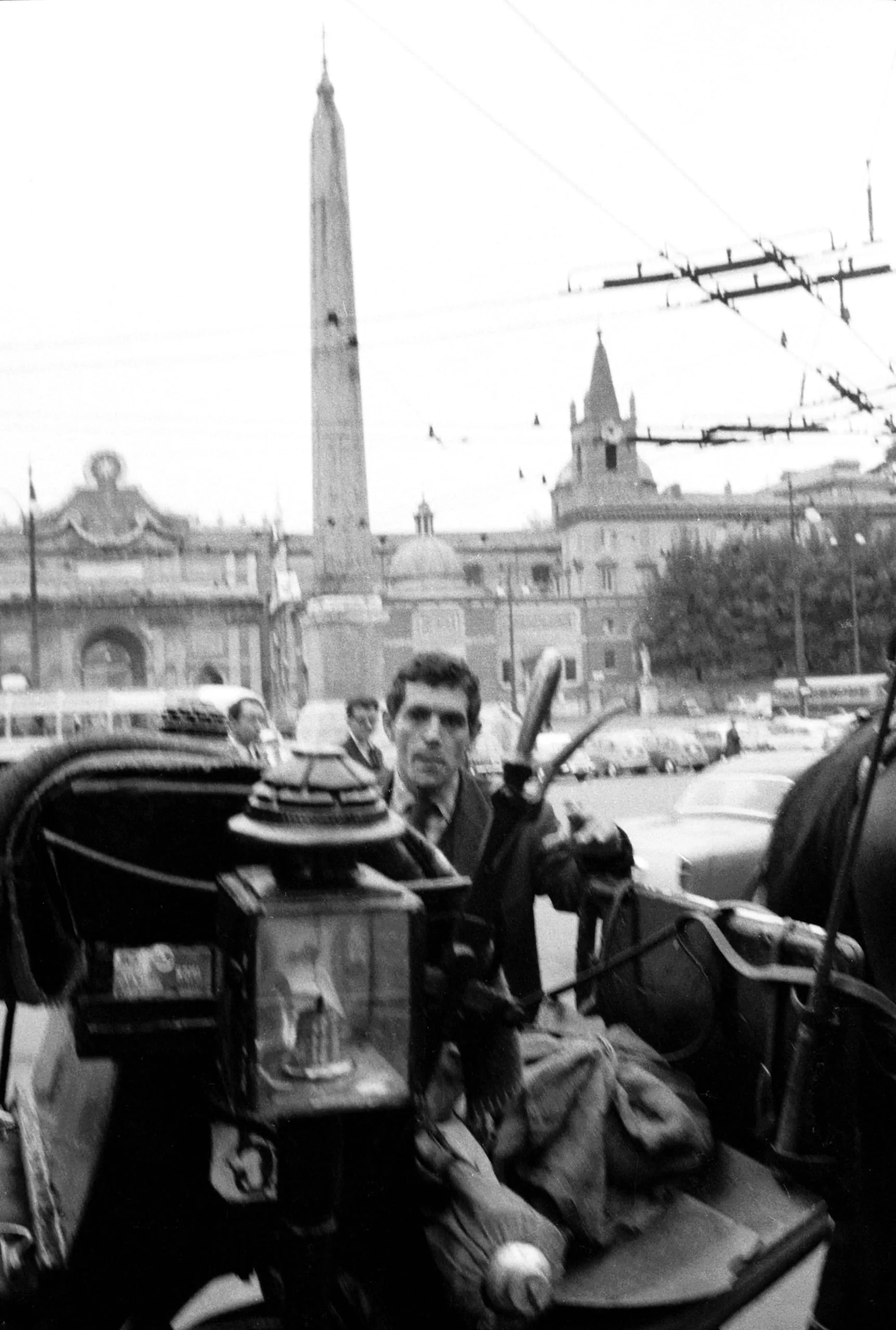 Black and white photograph of a horse-carriage driver facing the camera, with an ornate lantern in the foreground and a large piazza with an obelisk behind him