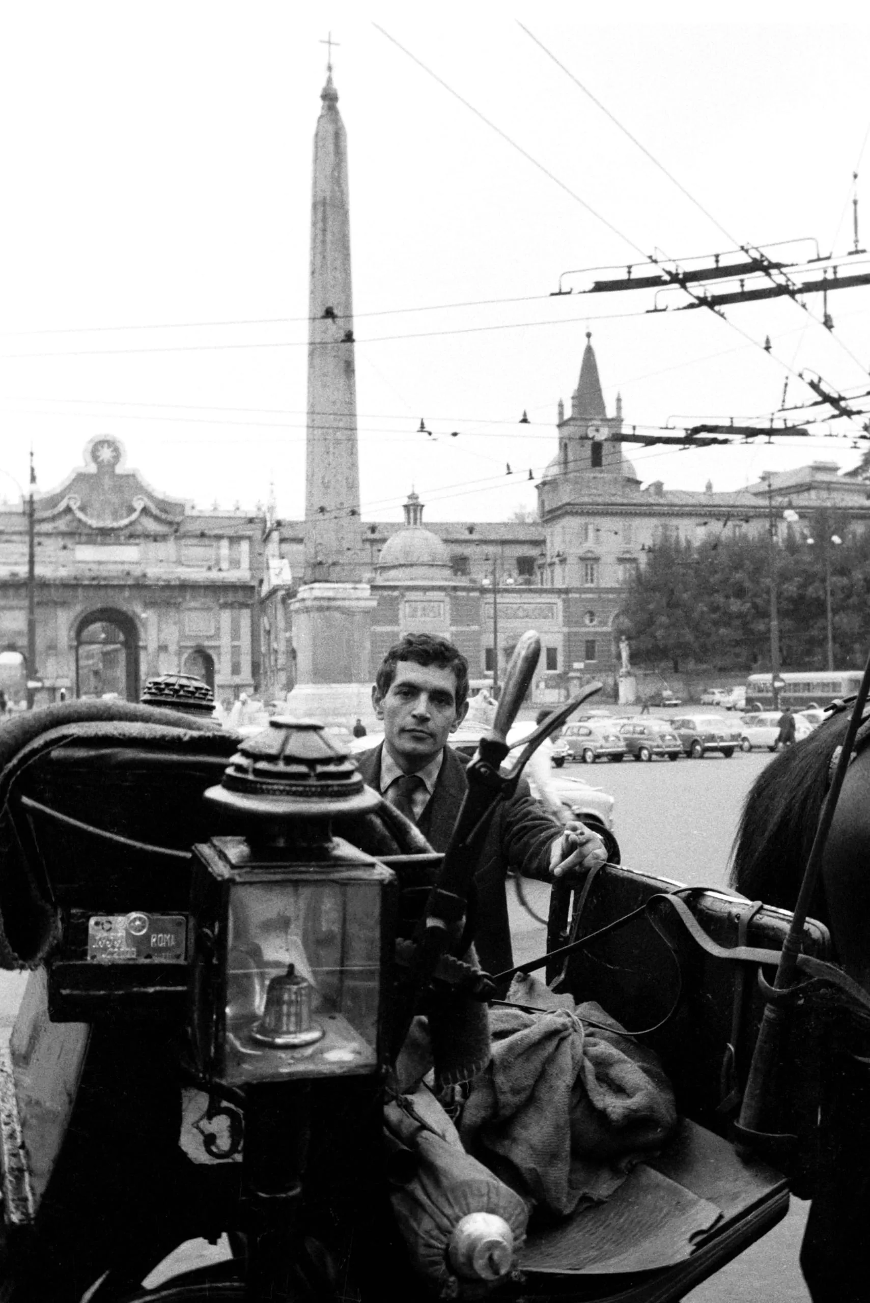 Black and white photograph of a young man seated on a horse-drawn carriage in a Roman piazza, with an obelisk and ornate gateway visible behind him