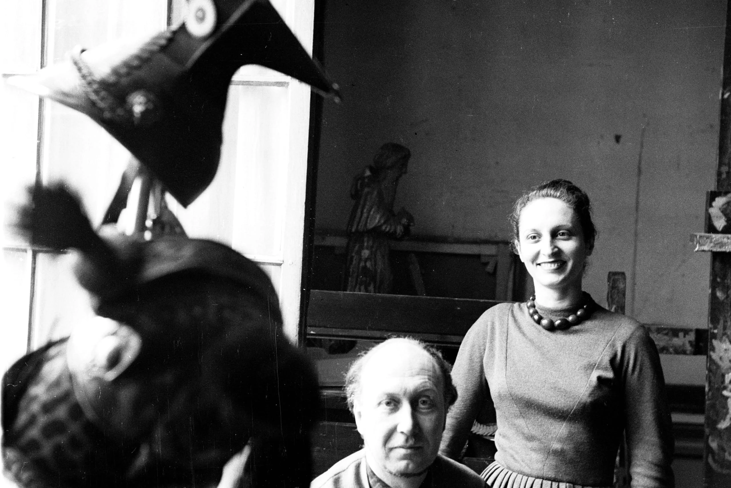 Black and white photograph of a bald man seated and a standing woman smiling, inside a studio with a sculptural figure visible in the background