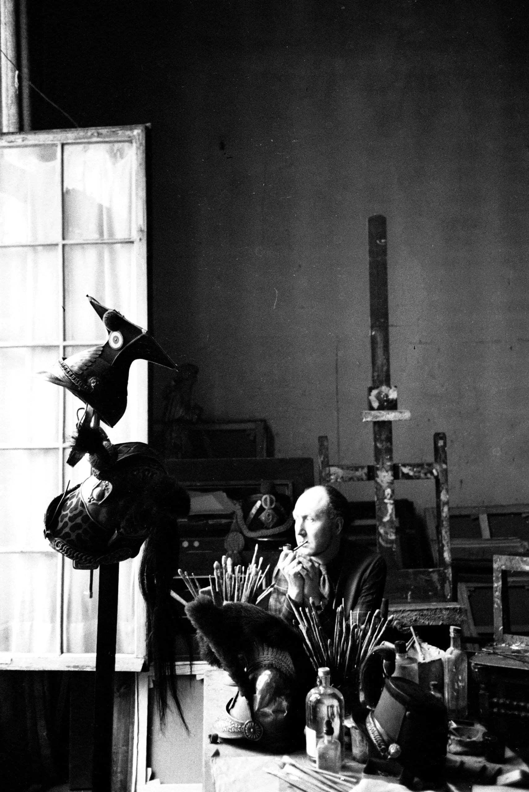 Black and white photograph of a bald man seated at a paint-brush-laden studio table, with a dark sculptural bird-like figure mounted on a stand in the foreground