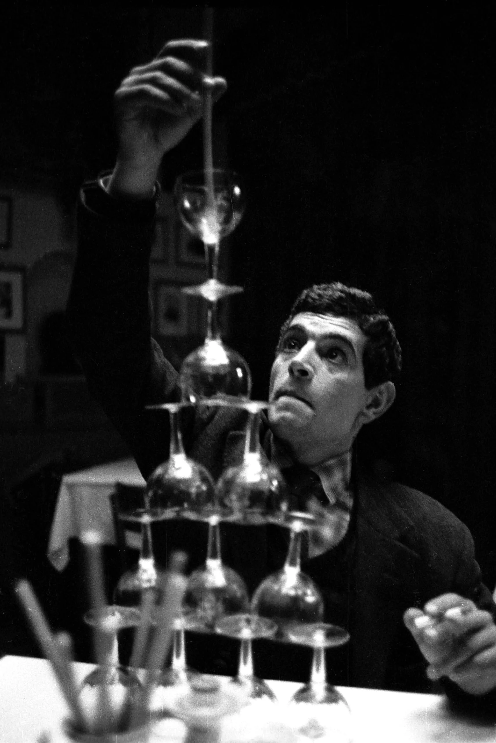Black and white photograph of a man stacking wine glasses into a tall pyramid, his face tilted upward in strong directional light against a dark background