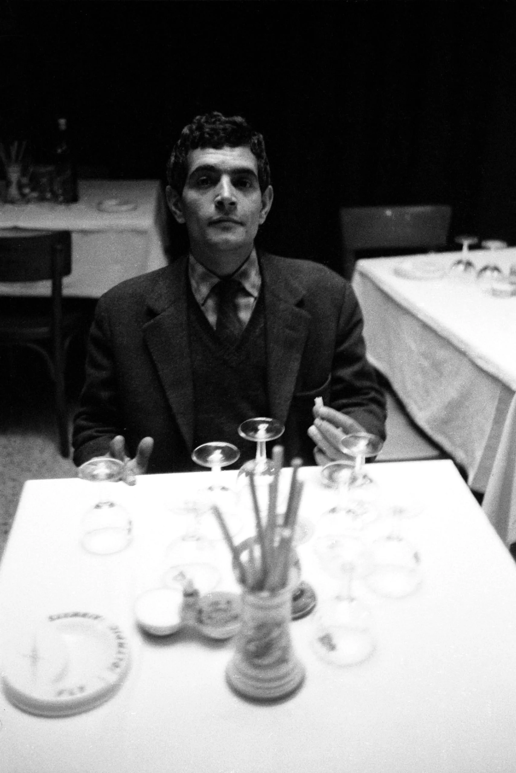 Black and white photograph of a man seated at a restaurant table, hands raised with open palms, lit harshly from above, stemware and breadsticks in the foreground