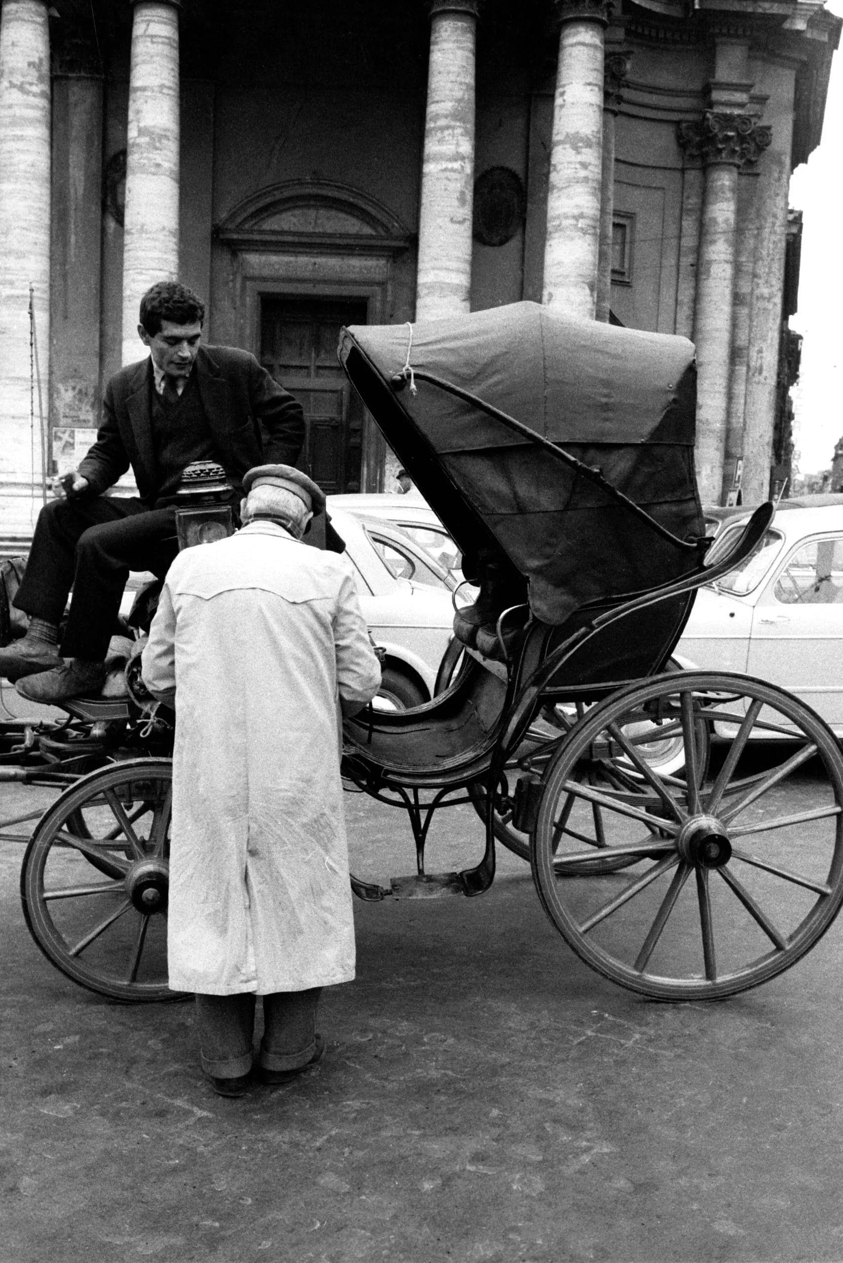 Black and white photograph of two men beside a horse-drawn carriage on a cobblestone street, large columned building in the background