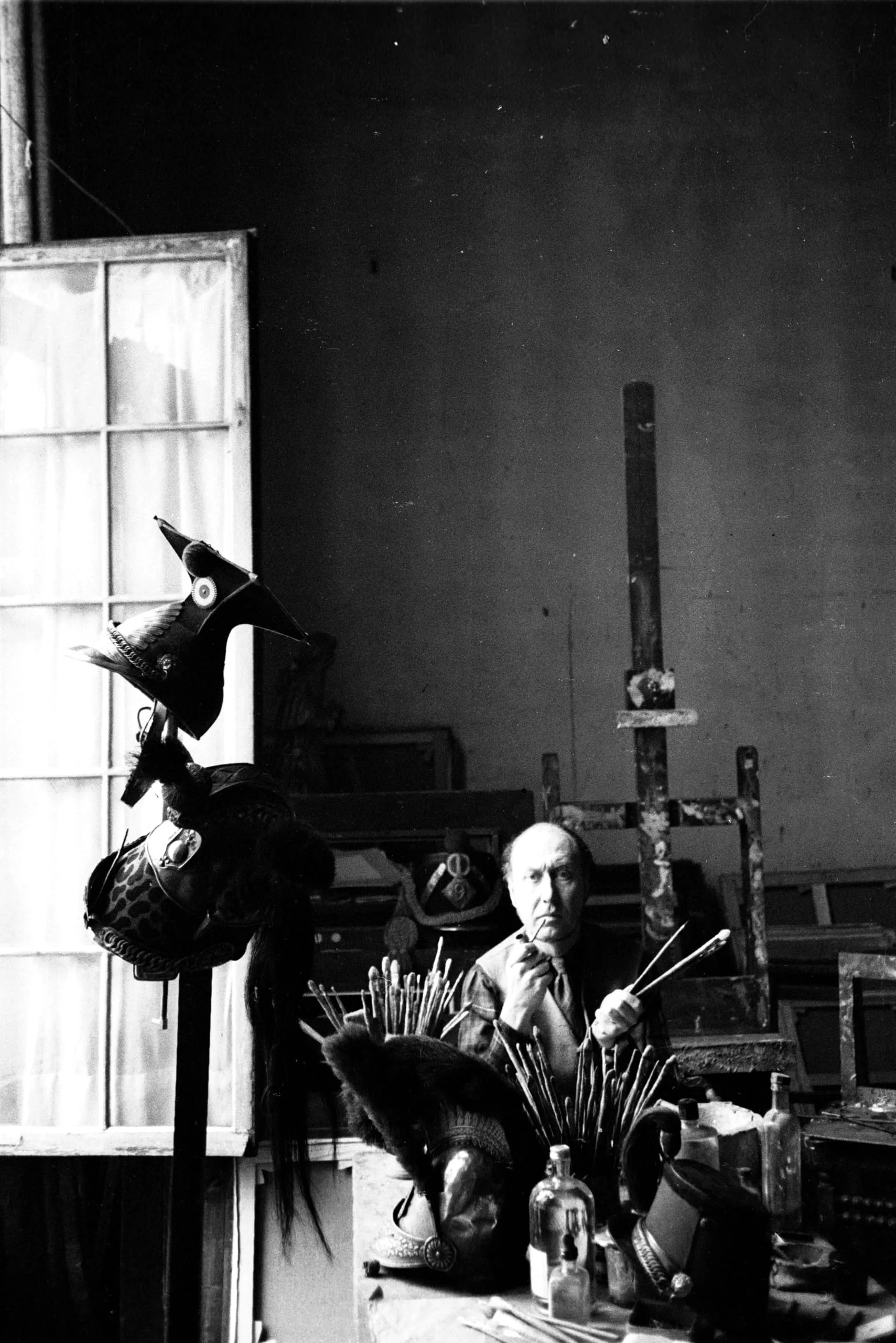 Black and white photograph of a man seated at a studio worktable surrounded by brushes, jars, and mask-like objects, with an easel visible in the background