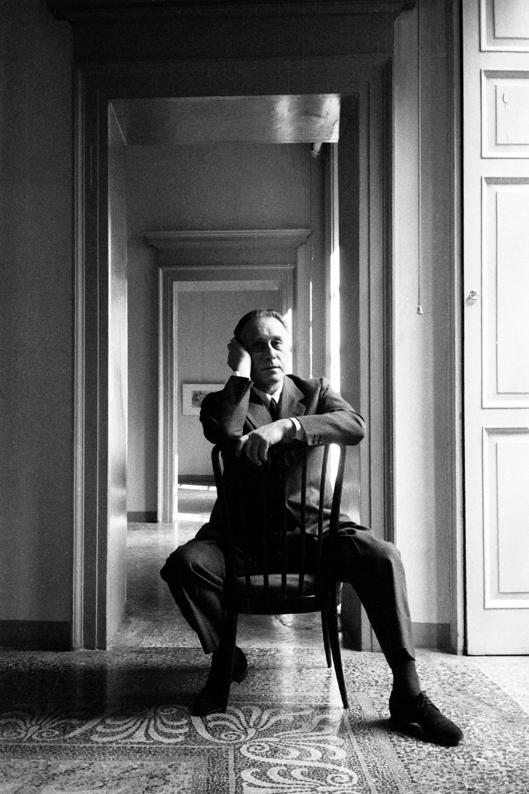 Black and white photograph, full-length portrait of a man in a dark suit seated in a wooden chair at a doorway, corridor receding behind him