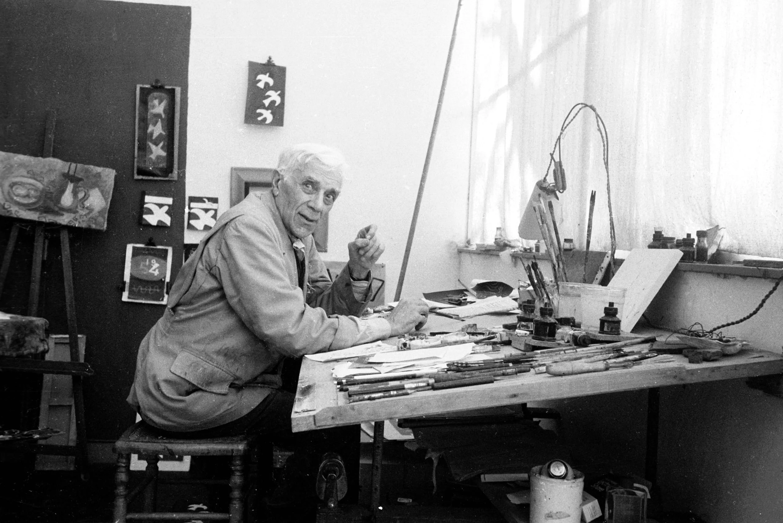Black and white photograph of an elderly white man in a work smock seated at a tool-covered worktable in an artist's studio, turning to look at the camera