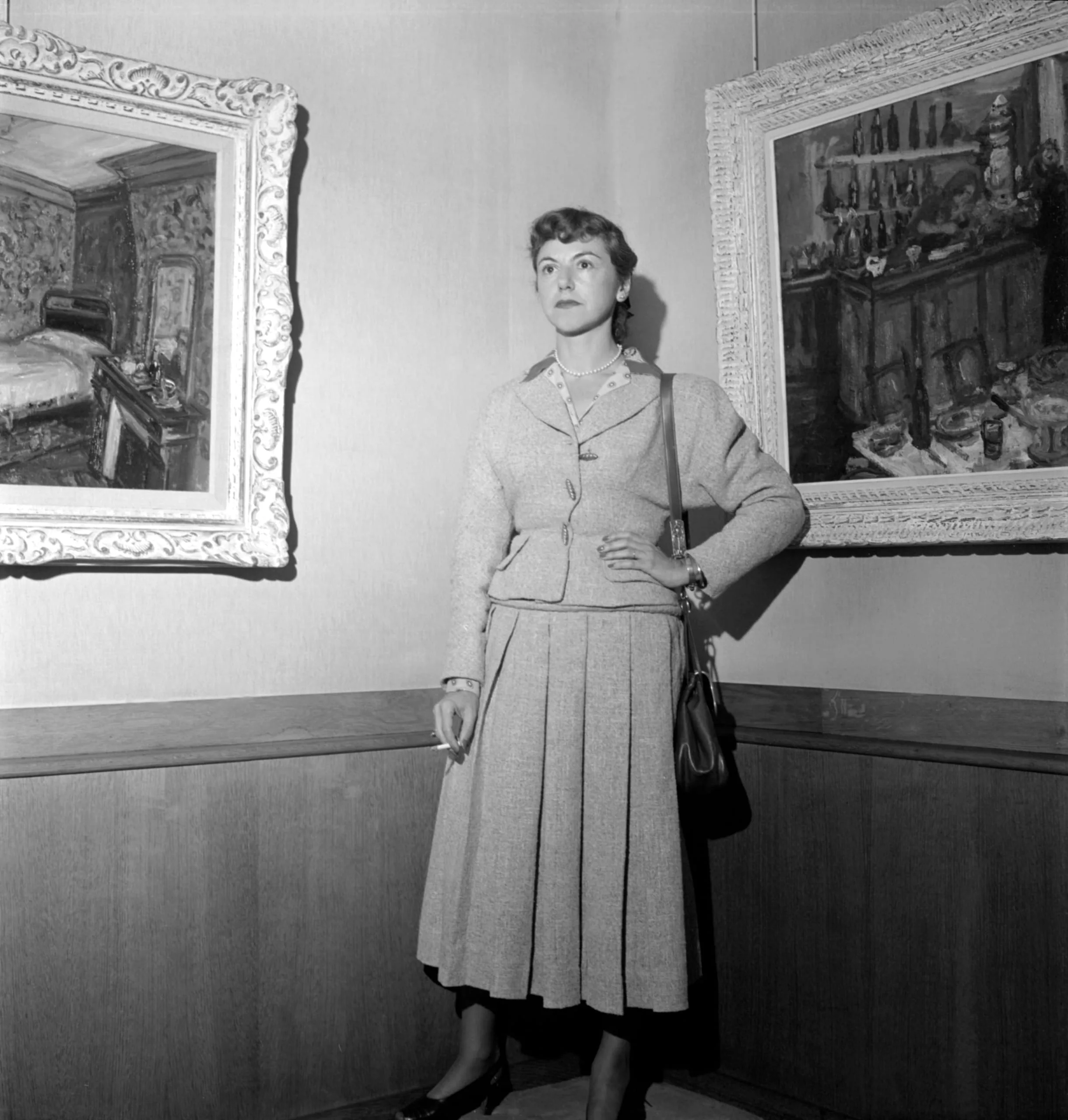 Black and white photograph of a woman in a tweed suit standing between two framed paintings in a gallery, holding a cigarette, looking upward