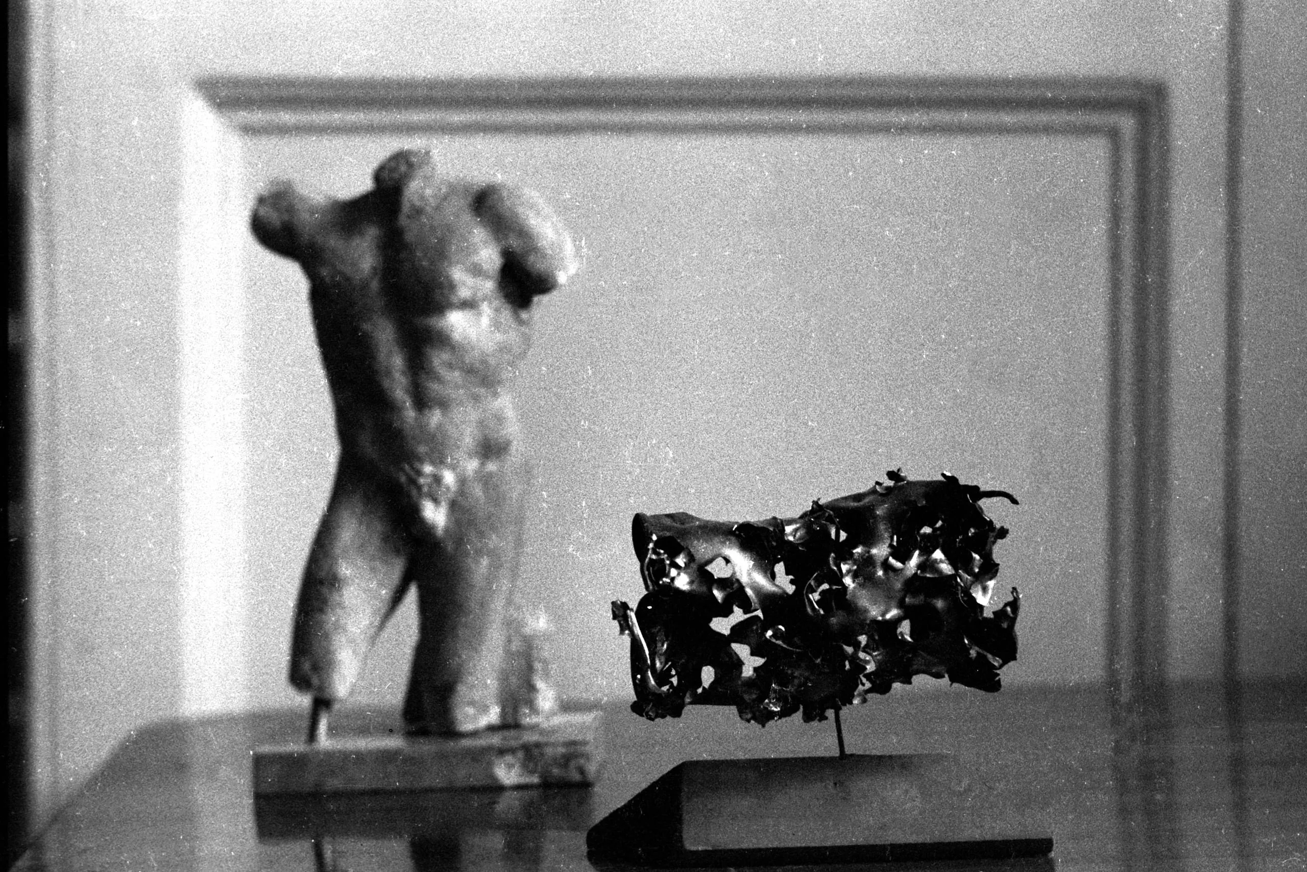 Black and white photograph of two small sculptures on a dark table: a blurred pale torso figurine at left and a sharp-focused jagged dark metal form at right
