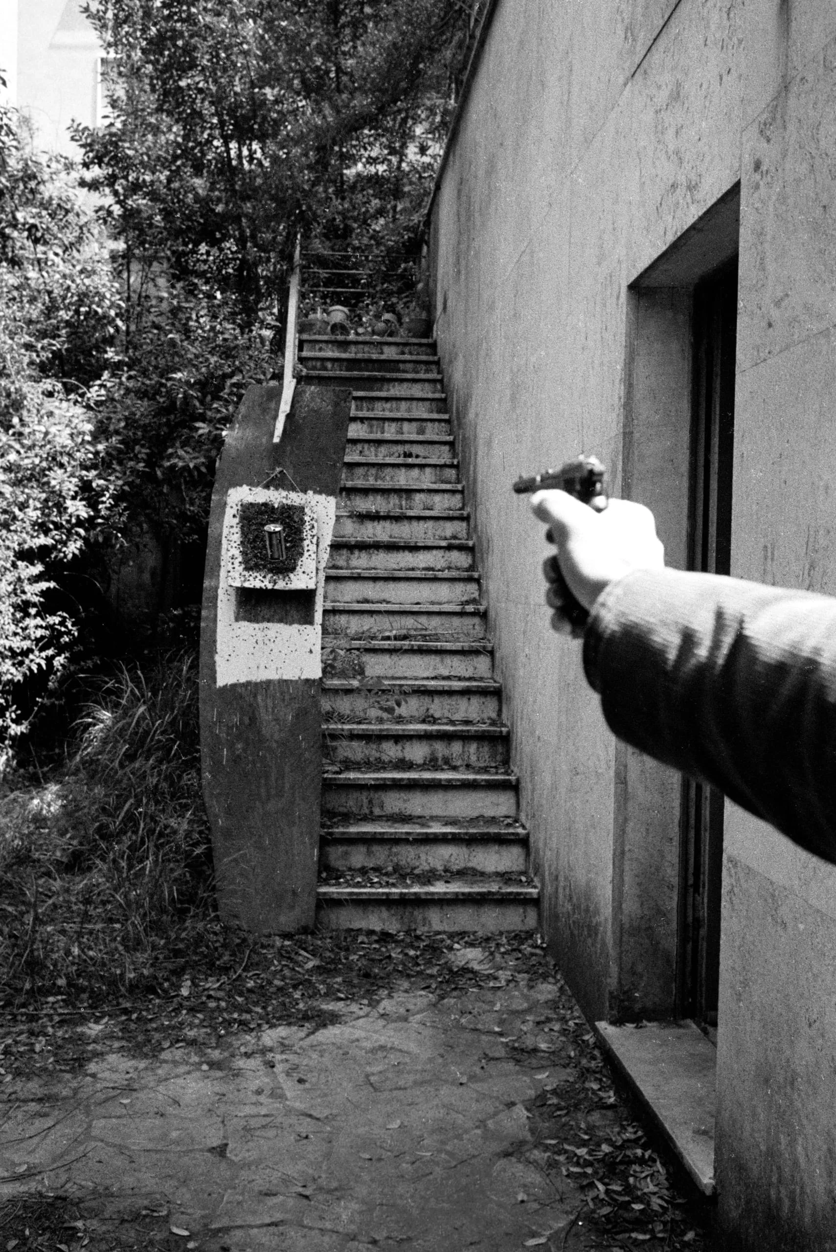 Black and white photograph of an outstretched arm holding a small handgun aimed at a spattered target board mounted on a concrete wall, with a wide staircase receding into the distance
