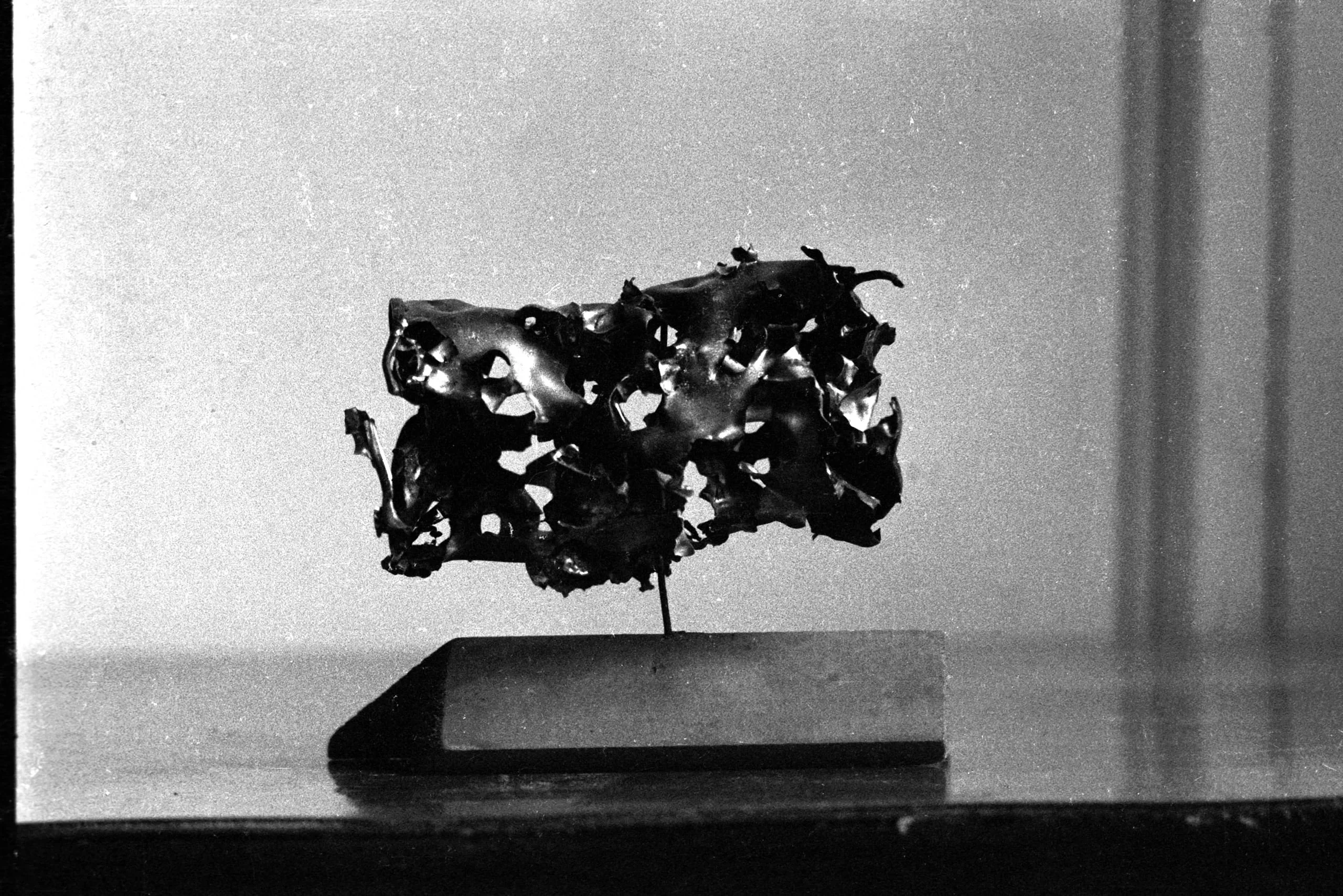 Black and white photograph of a small dark metal sculpture with jagged, curling forms mounted on a thin rod over a flat rectangular base