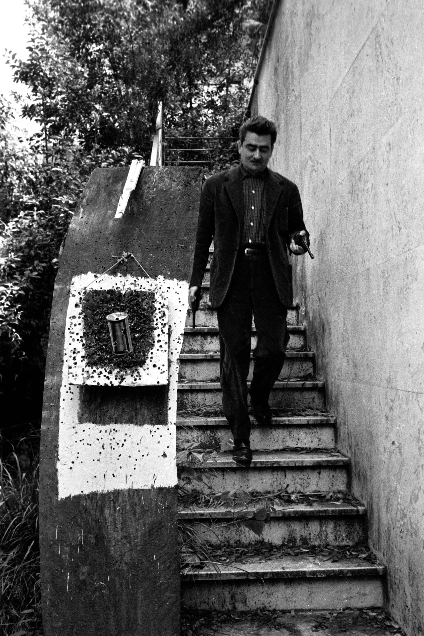 Black and white photograph of a man in a dark blazer descending concrete outdoor steps, beside a curved concrete wall with a white-painted, spattered panel mounted to it