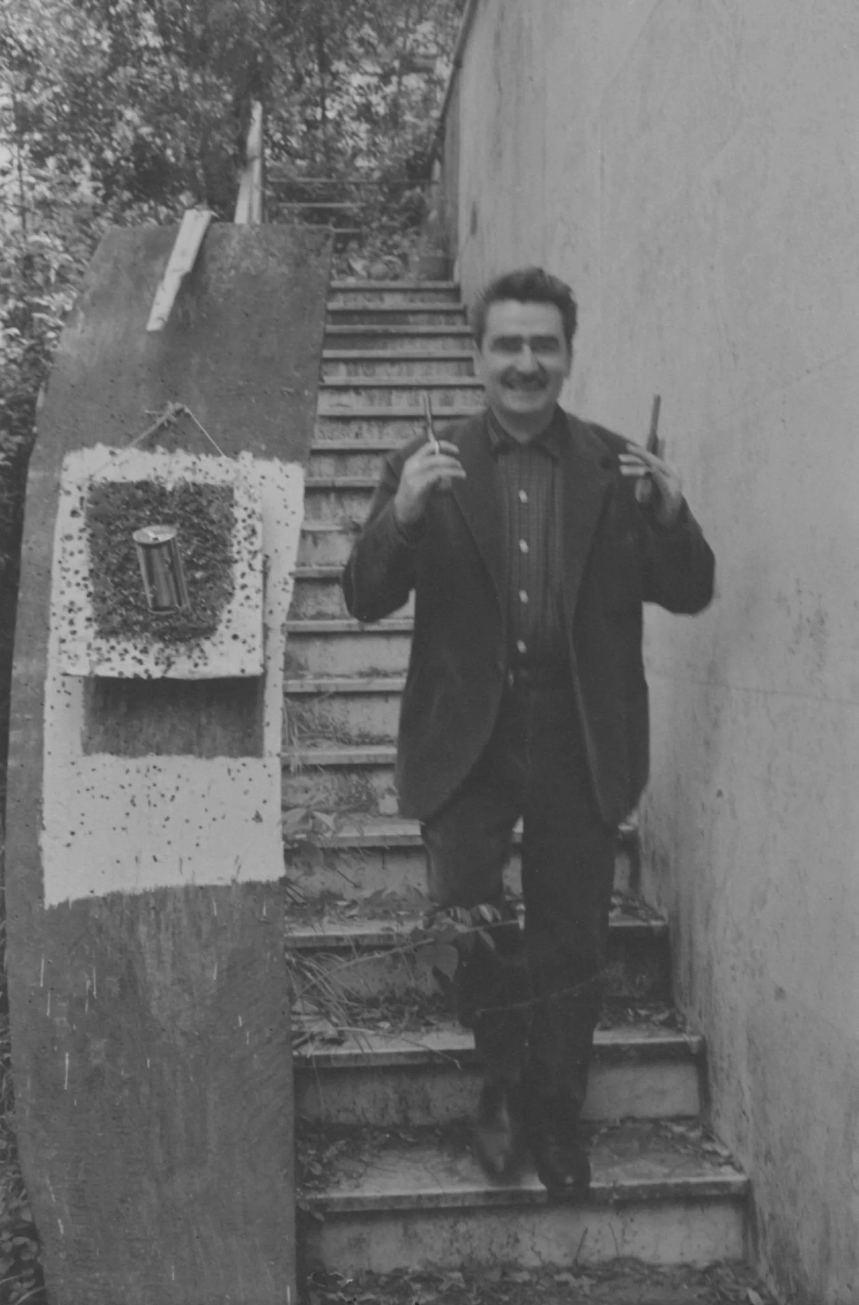 Black and white photograph of a smiling mustachioed man in a dark blazer standing on outdoor stairs, holding two thin implements, beside a mounted artwork on a concrete panel