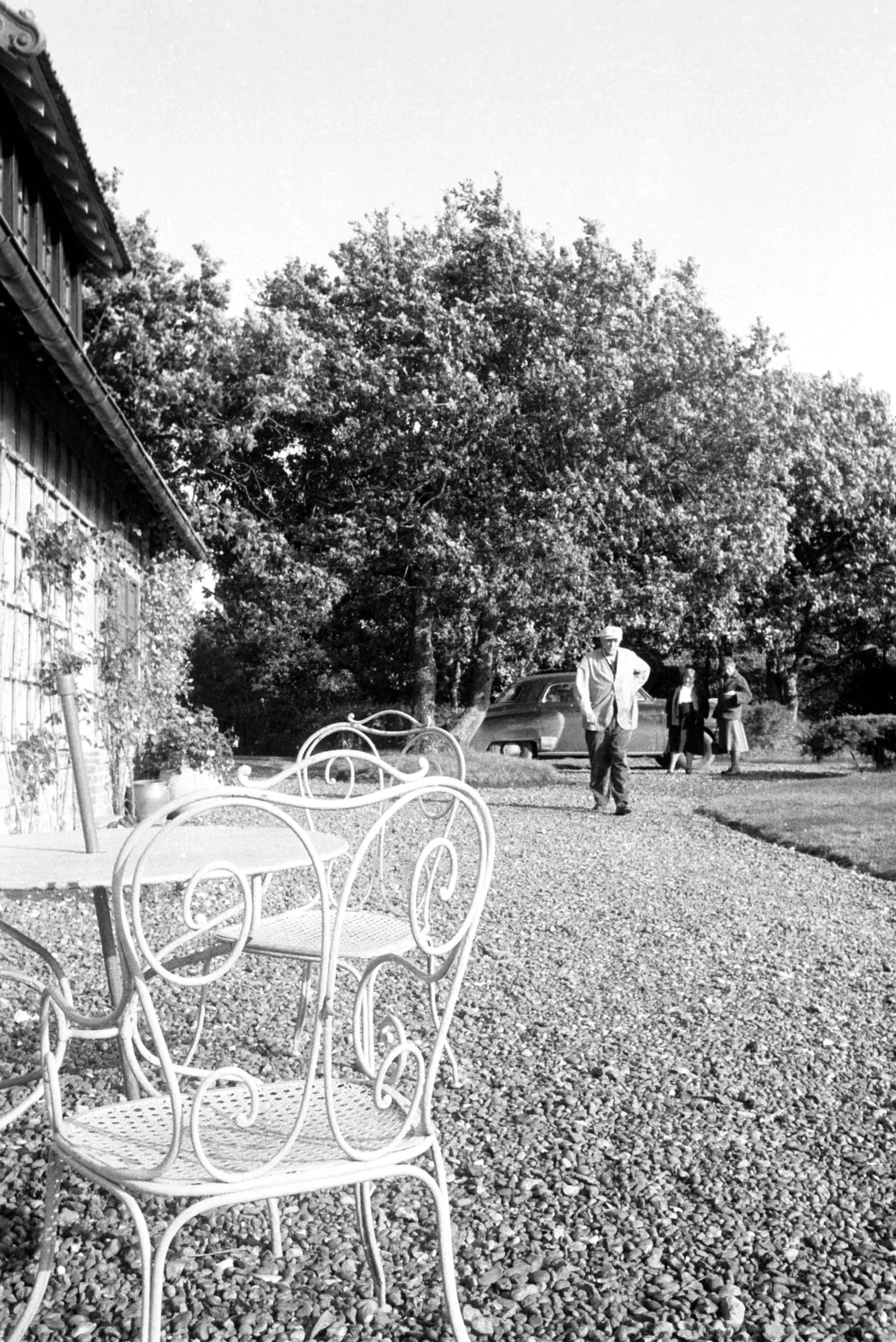 Black and white photograph of a gravel courtyard with white wrought-iron garden furniture in the foreground, a man walking toward the camera, and leafy trees beyond