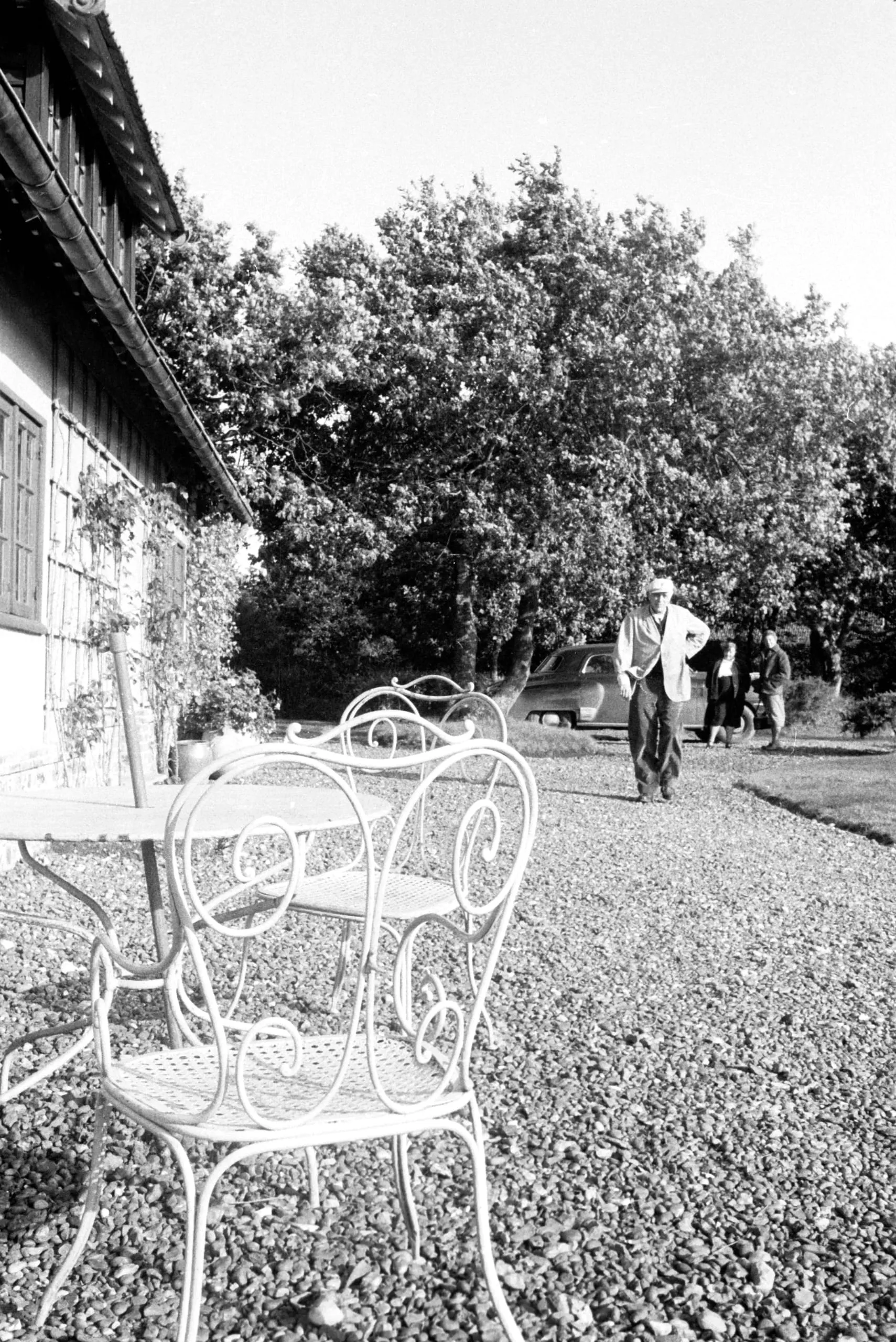 Black and white photograph of an outdoor gravel path beside a building, with white wrought-iron garden chairs in the foreground and three figures walking in the distance