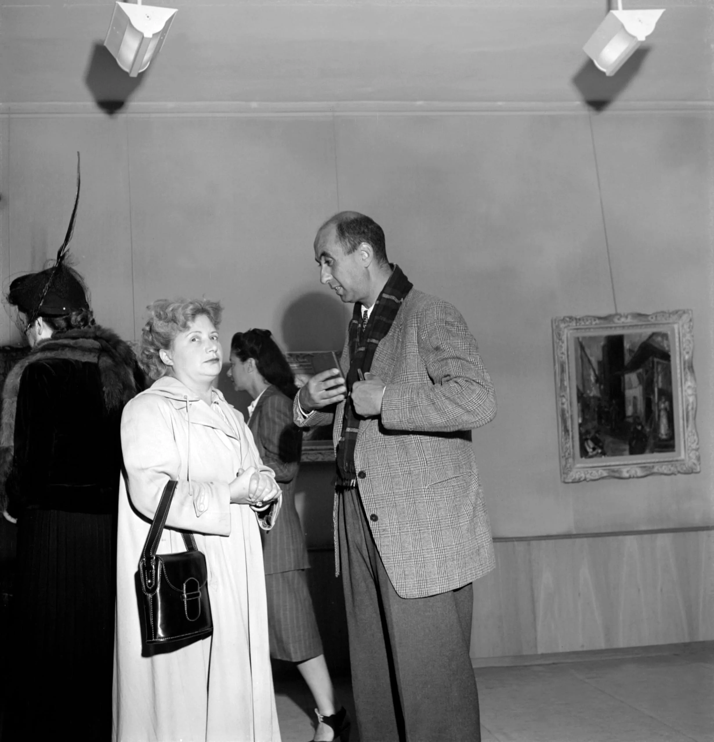 Black and white photograph of two people conversing in an art gallery, a woman in a light coat and a tall man in a plaid jacket, with framed paintings on the wall behind them