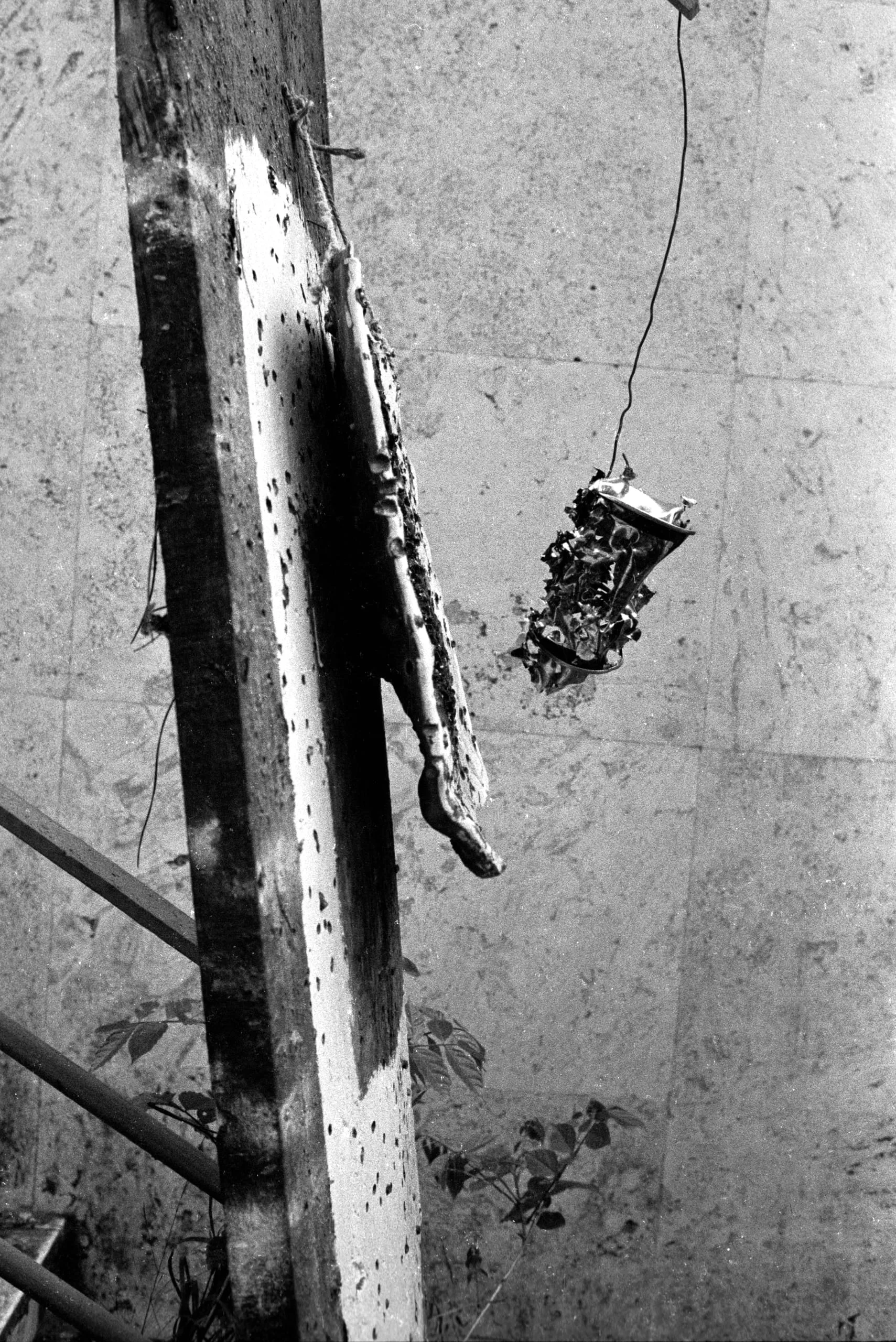 Black and white photograph of a weathered wooden post with a diagonal strip of material leaning against it, and a dense crumpled mass suspended by wire, against a stone panel wall