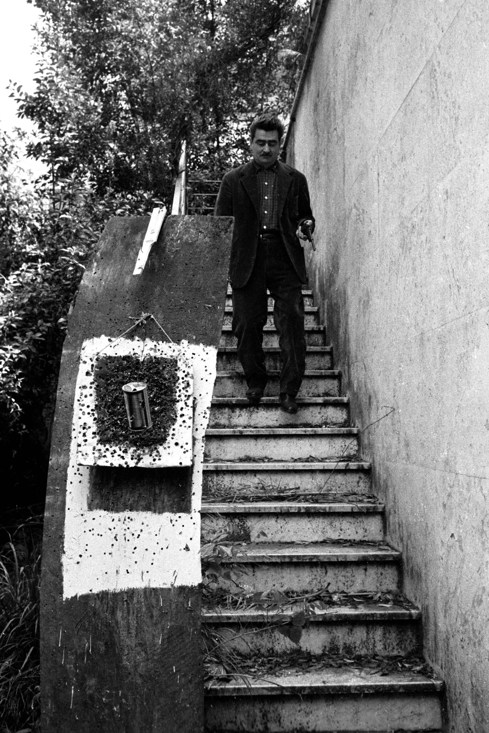 Black and white photograph of a man descending an outdoor staircase, with a white panel mounted on the concrete balustrade displaying a small metal object surrounded by dark organic material