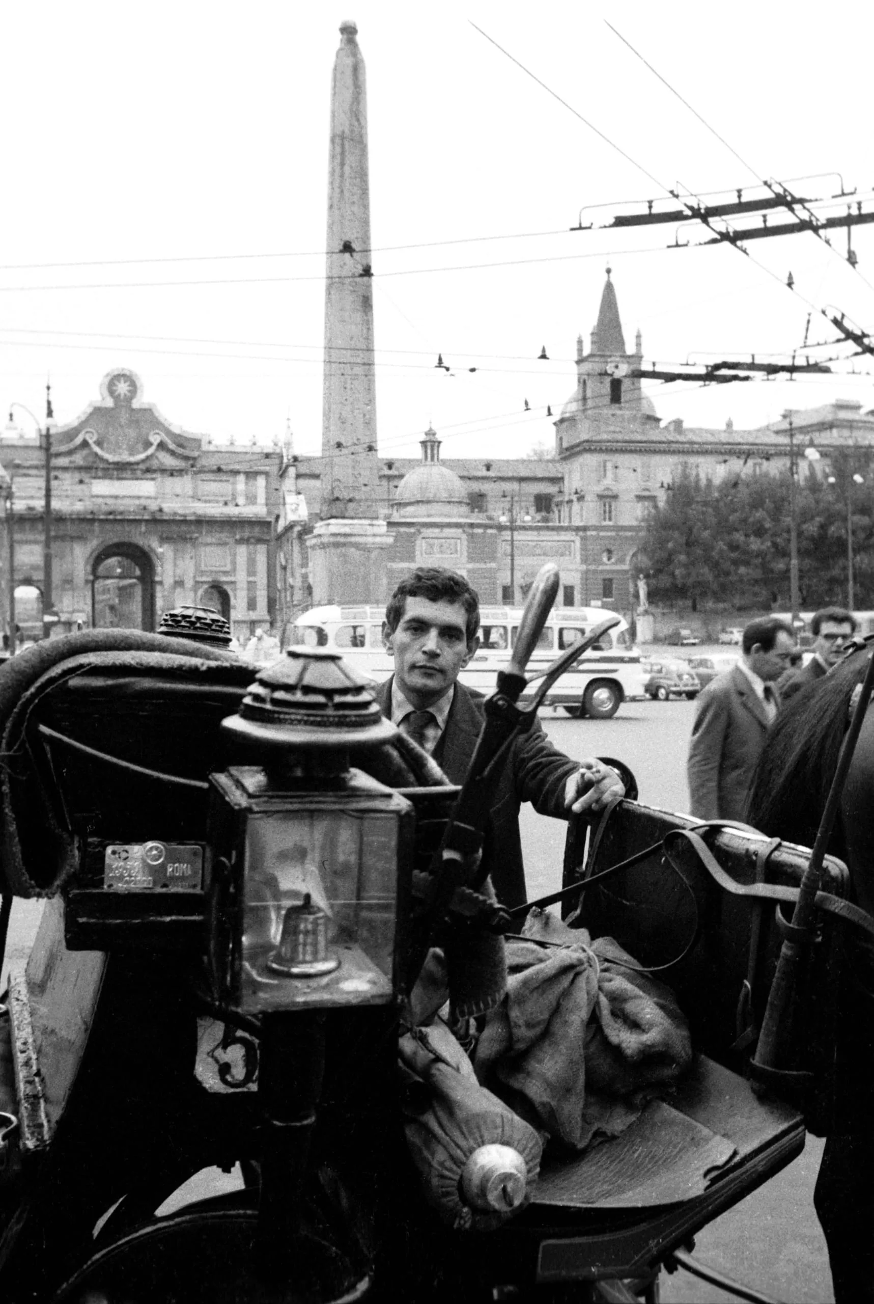 Black and white photograph of a young man seated on a horse-drawn carriage in a Roman piazza, with an obelisk and city buildings visible in the distance