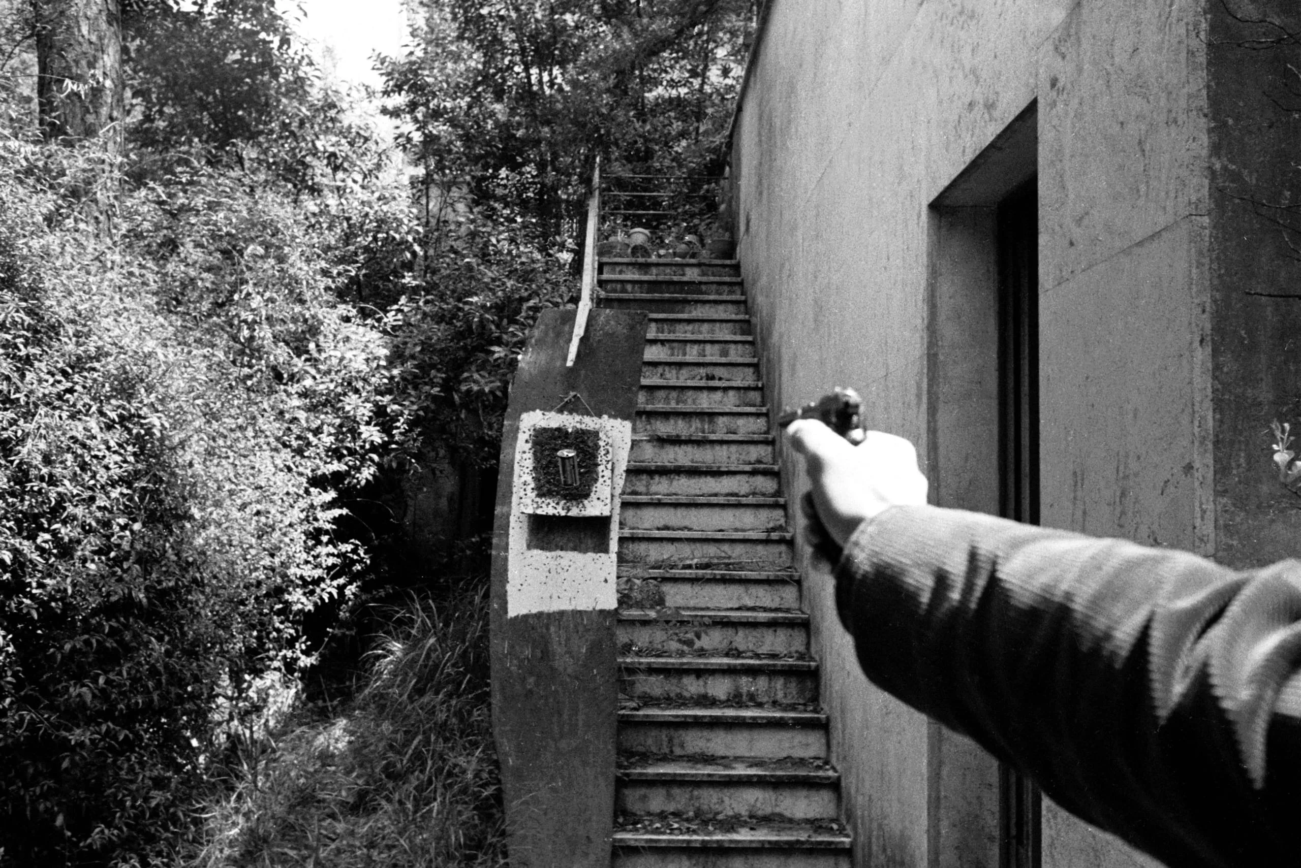 Black and white photograph of a hand gripping a pistol aimed at a paper target mounted on a concrete staircase wall, flanked by trees