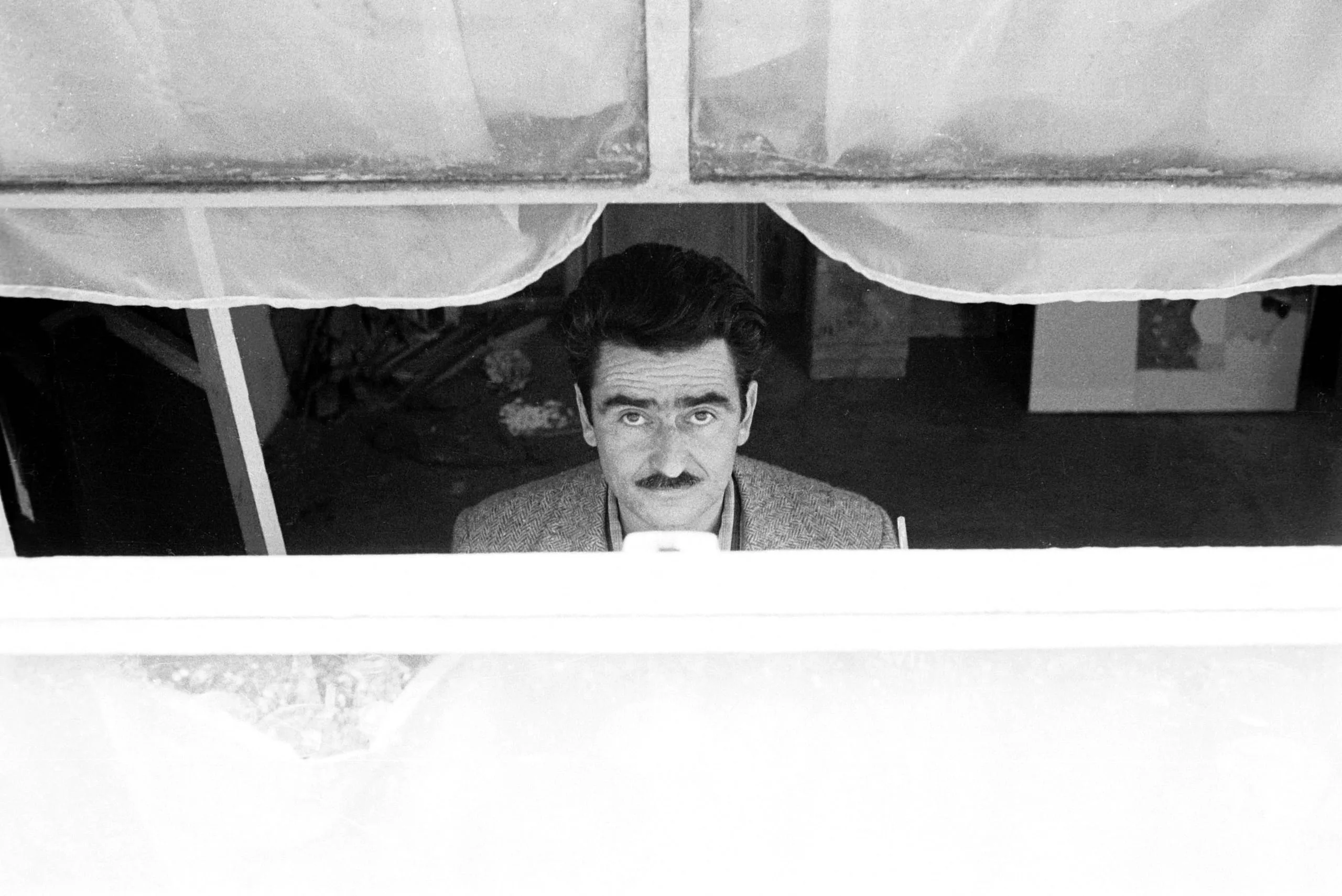 Black and white photograph of a mustachioed man with dark hair peering through a narrow gap between two window ledges, holding a white cup