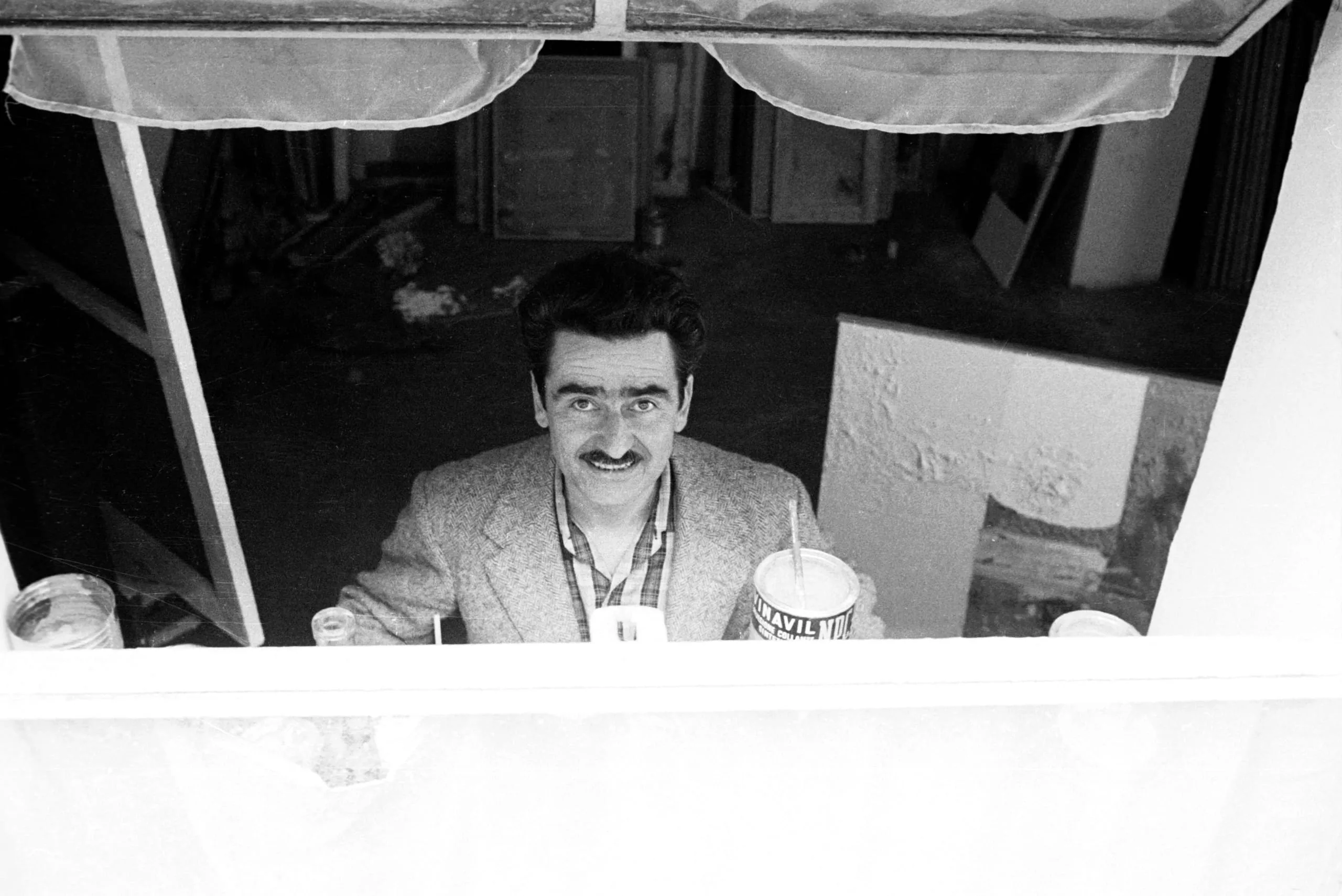 Black and white photograph, shot from above through a service window opening, a smiling man with a dark mustache looks up at the camera, containers on the ledge in front of him