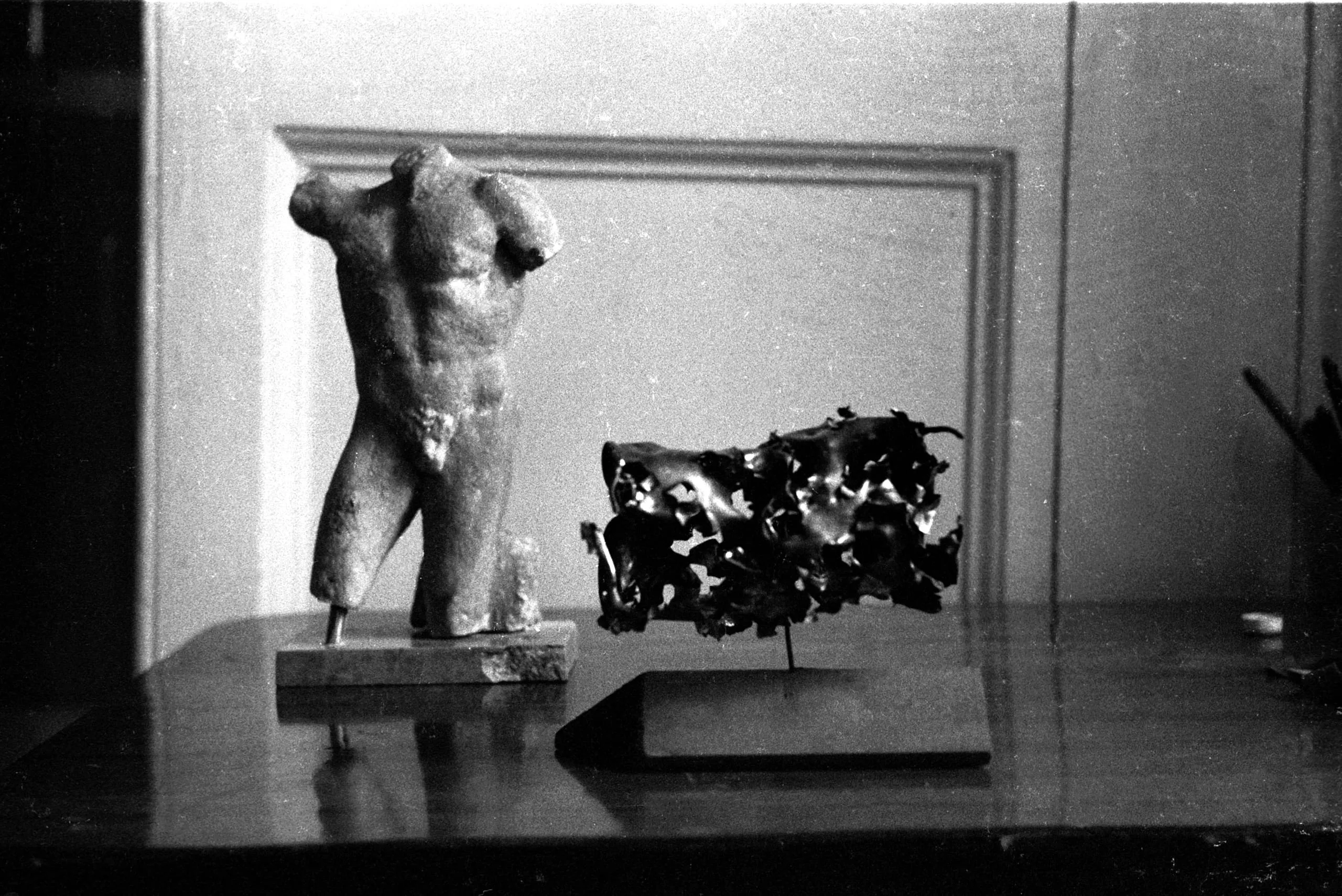 Black and white photograph of two sculptures on a dark surface: a limbless stone male torso at left and an abstract jagged horizontal form at right