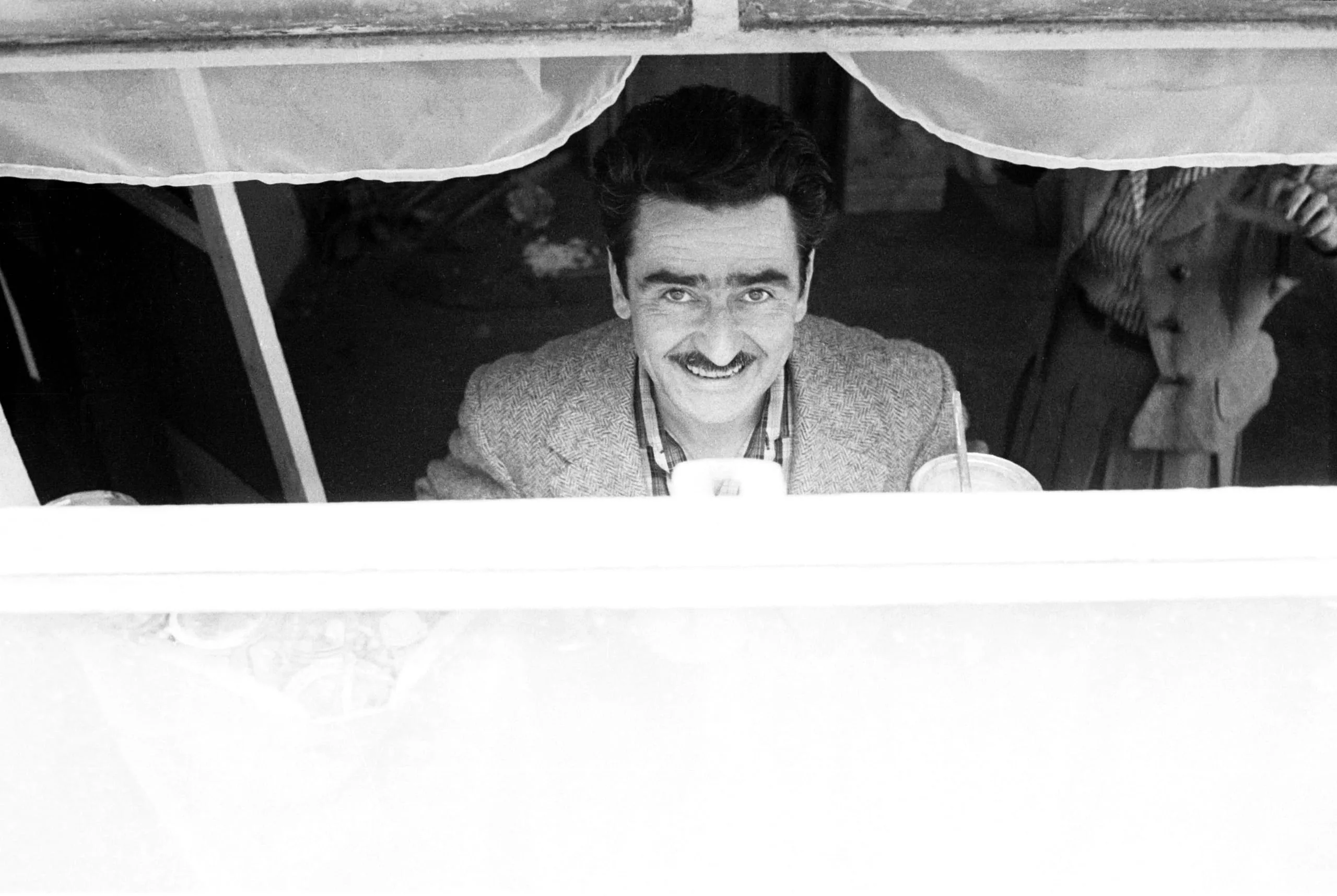 Black and white photograph, white man with dark wavy hair and mustache leaning through an open window, smiling broadly, two cups on the sill below