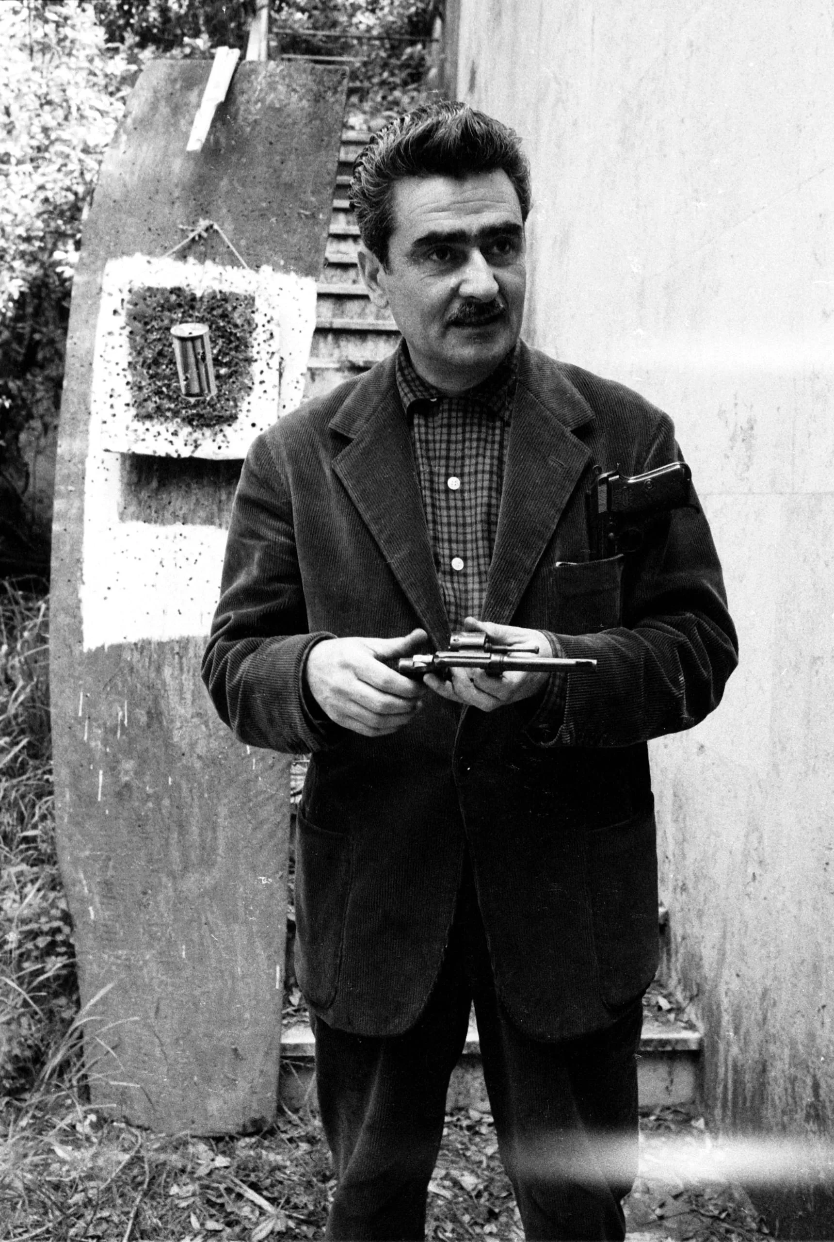 Black and white photograph of a mustachioed man in a corduroy jacket holding a small instrument, standing before a concrete slab with a painted geometric design