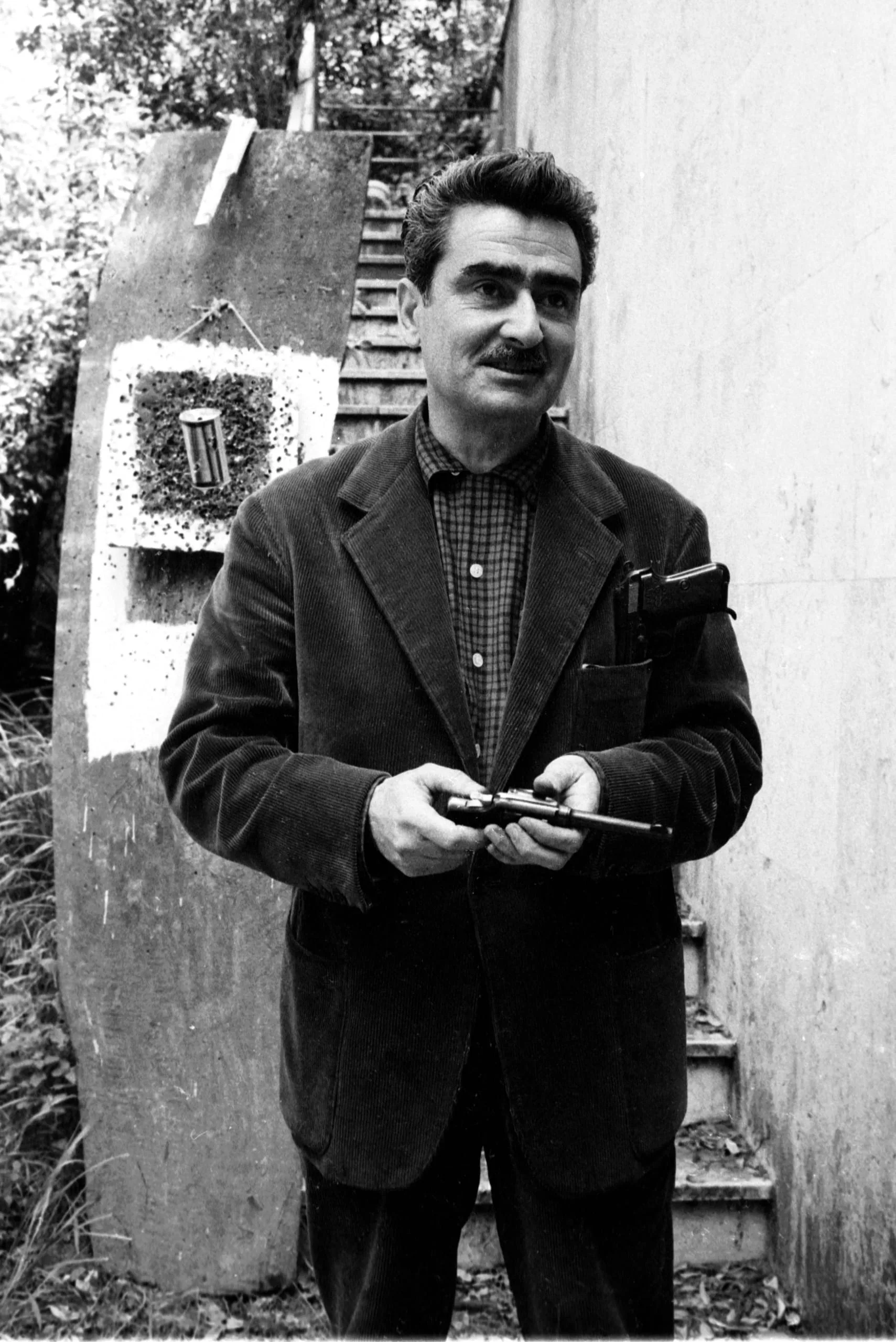 Black and white photograph, man from the hips up holding a small camera outdoors, standing before a large concrete sculptural slab with a painted white square relief