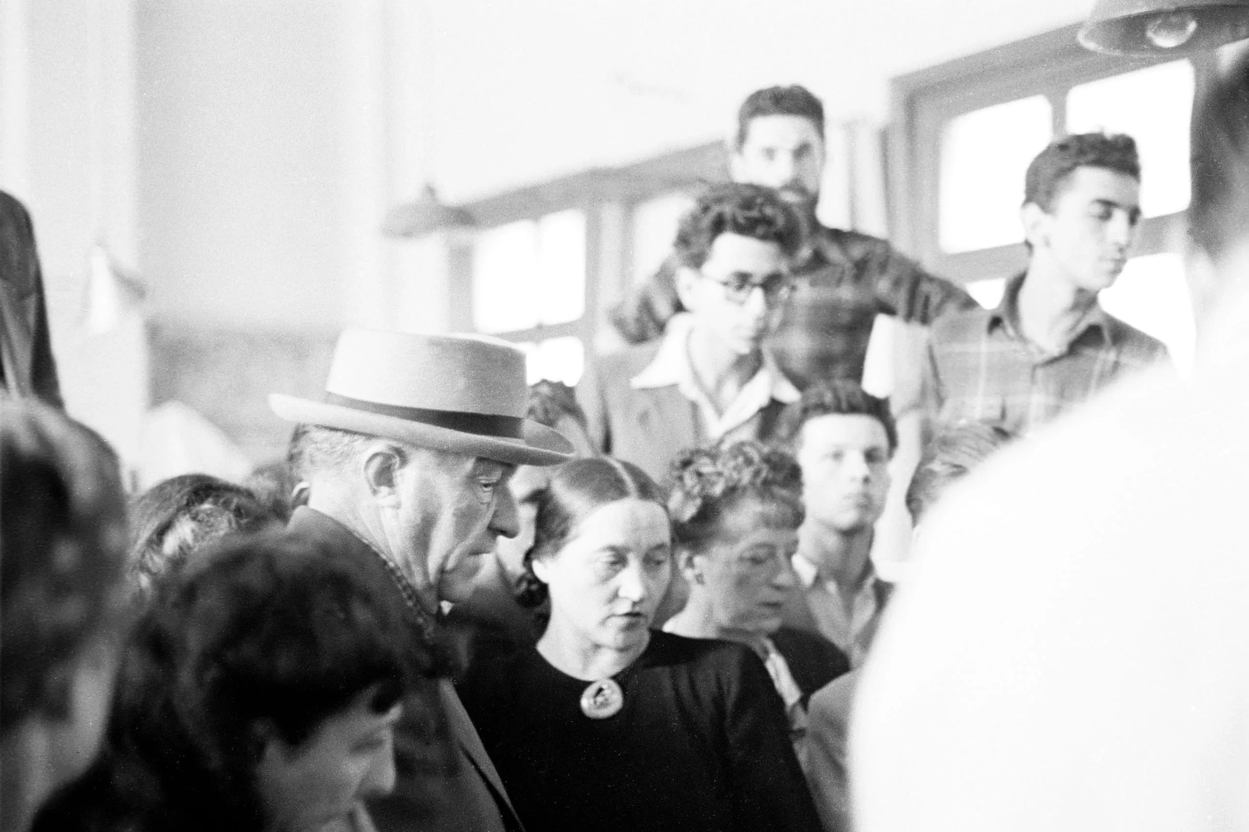 Black and white photograph of a crowd inside a bright room, centered on an older man in a wide-brimmed hat and a woman in a dark top with a brooch, surrounded by other figures