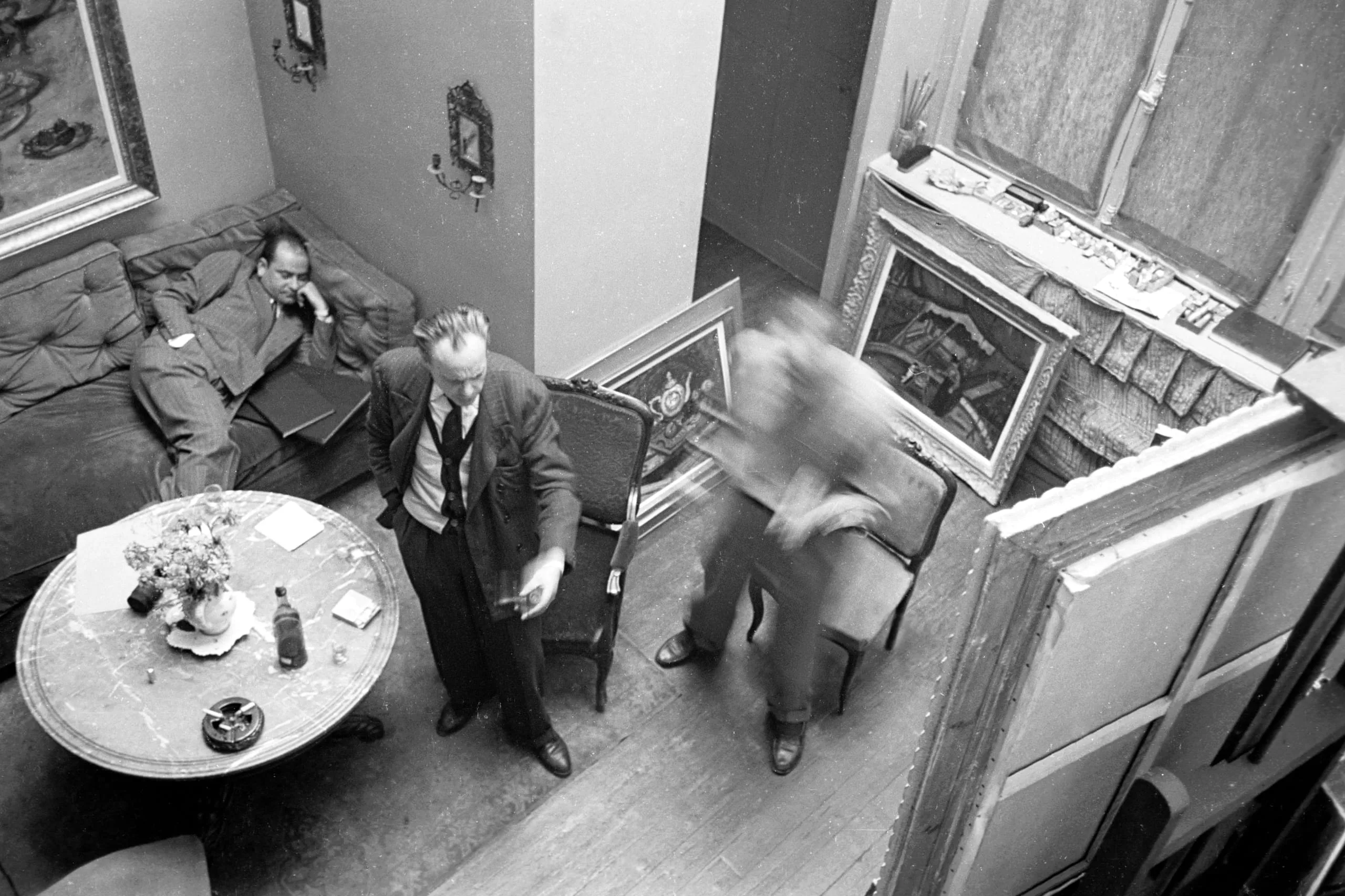 Black and white photograph shot from above showing three men in an art-filled interior, one reclining on a sofa, one standing with a cigarette, and one blurred by motion