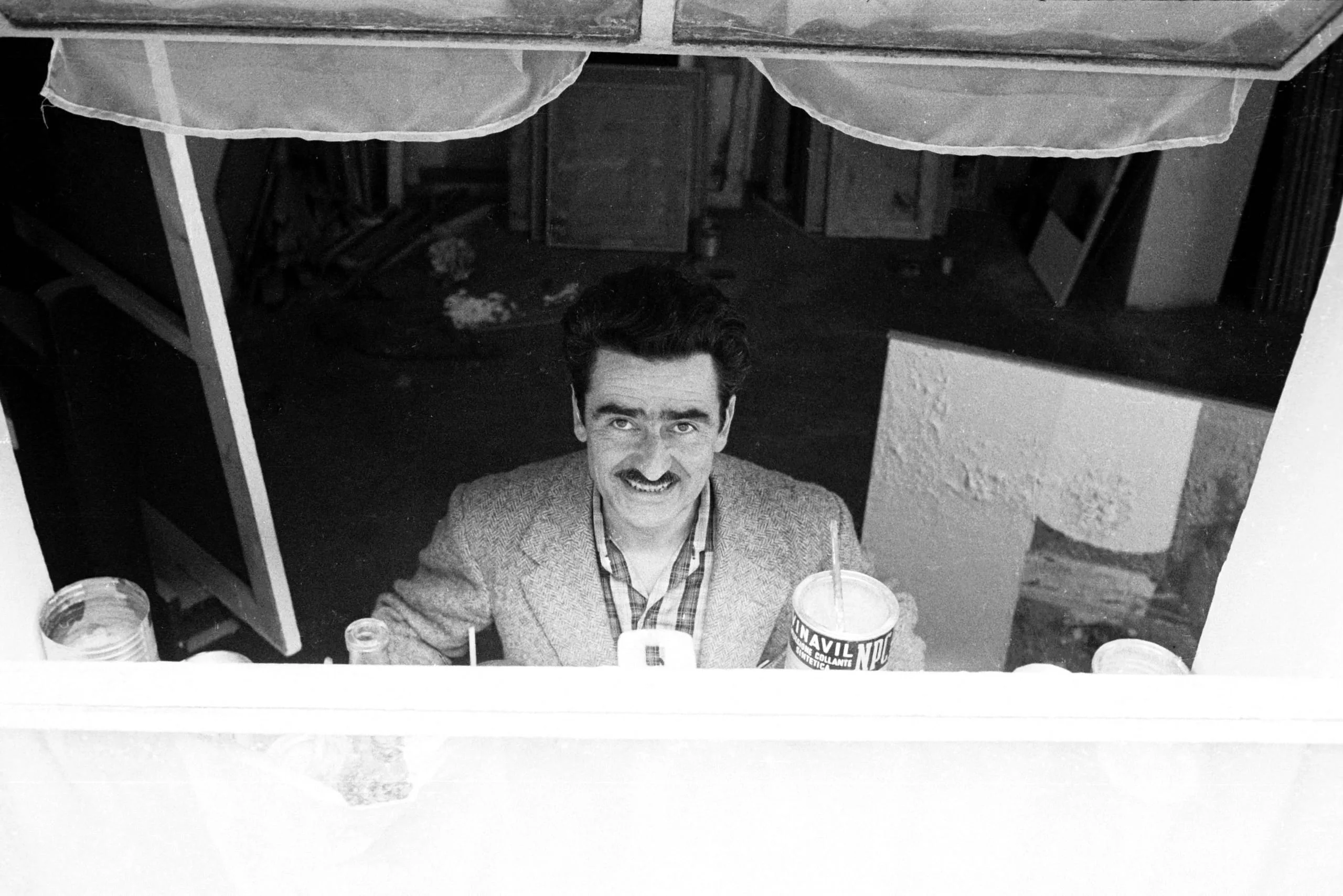 Black and white photograph, looking down through a service window at a smiling mustachioed man holding two large cups, with awnings framing the top of the shot