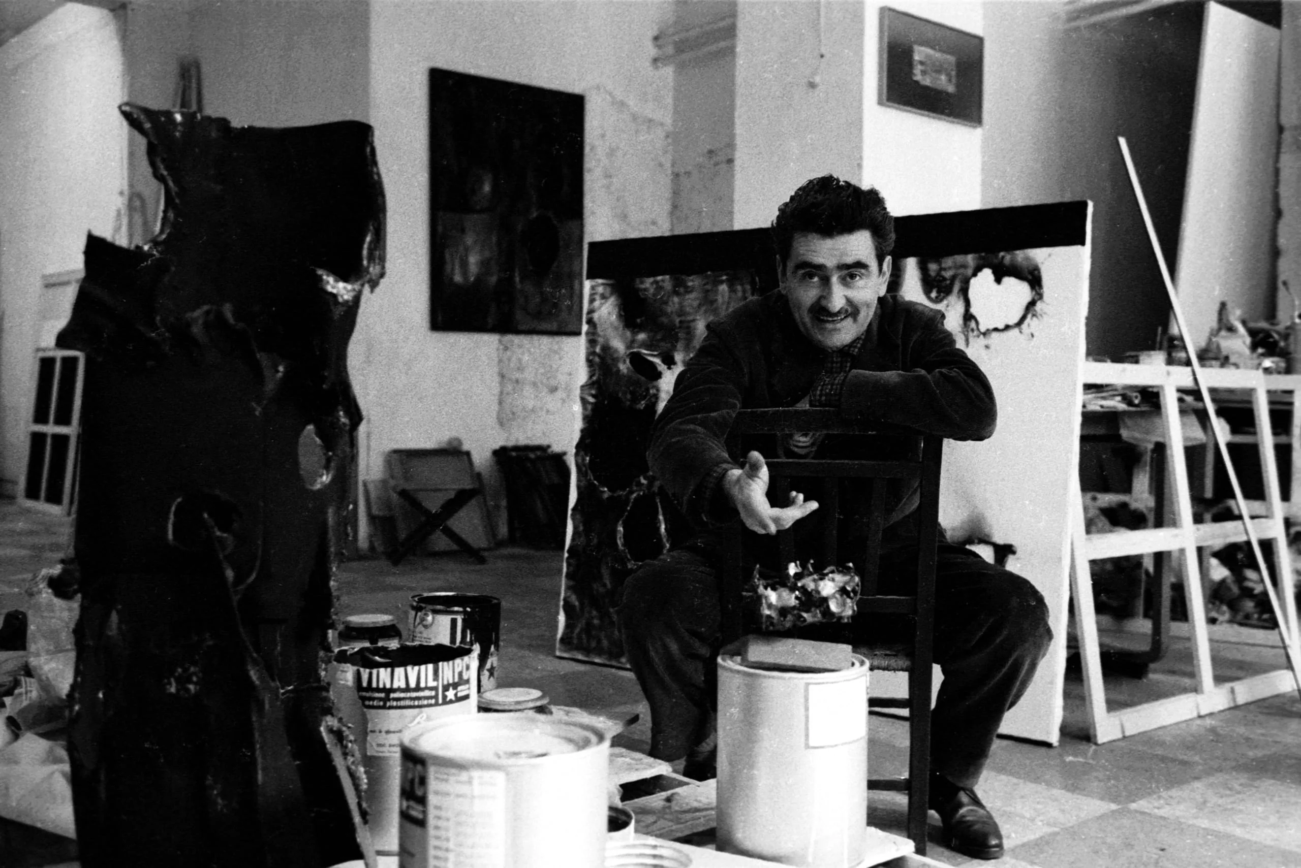 Black and white photograph of a man crouching behind a wooden chair in an art studio, surrounded by paint cans, dark sculptures, and large canvases