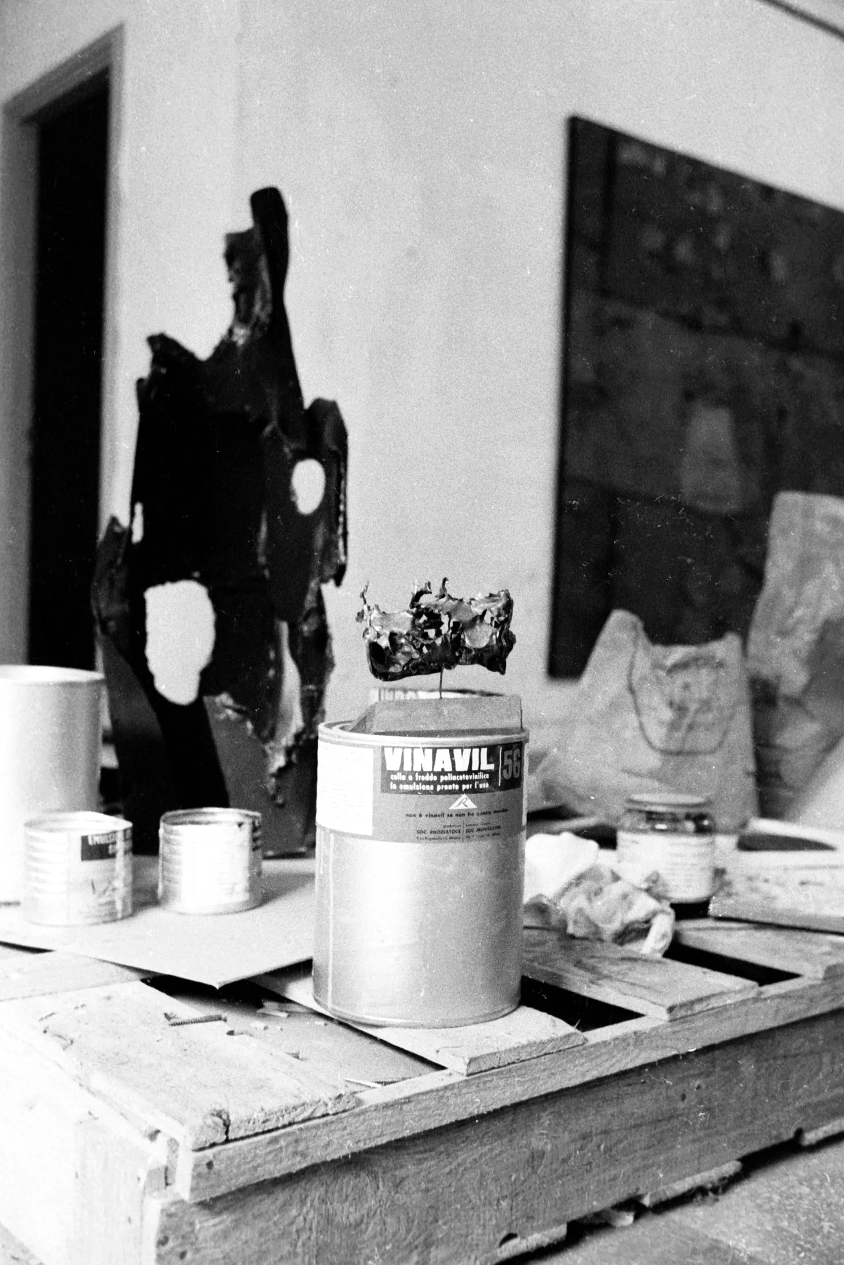 Black and white photograph of an artist's studio worktable with paint cans, including a labeled 'VINAVIL' tin with hardened material on top, and blurred sculptures in the background