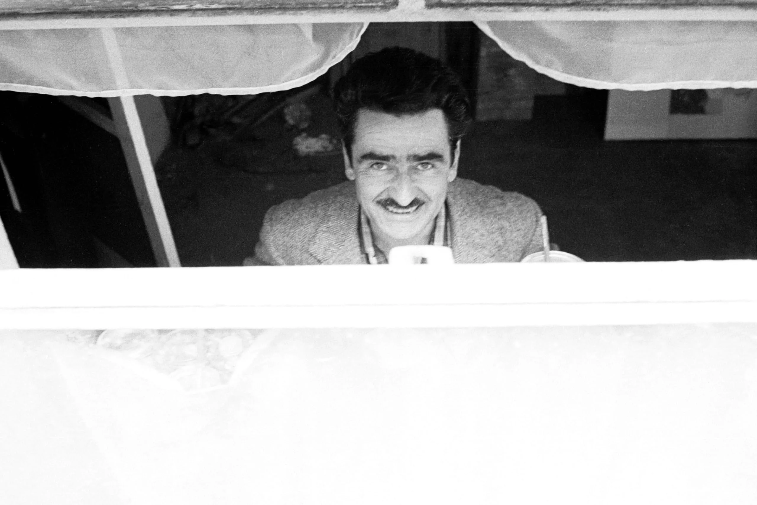 Black and white photograph of a man with a mustache peering through a narrow gap under a window blind, smiling at the camera and holding a white cup