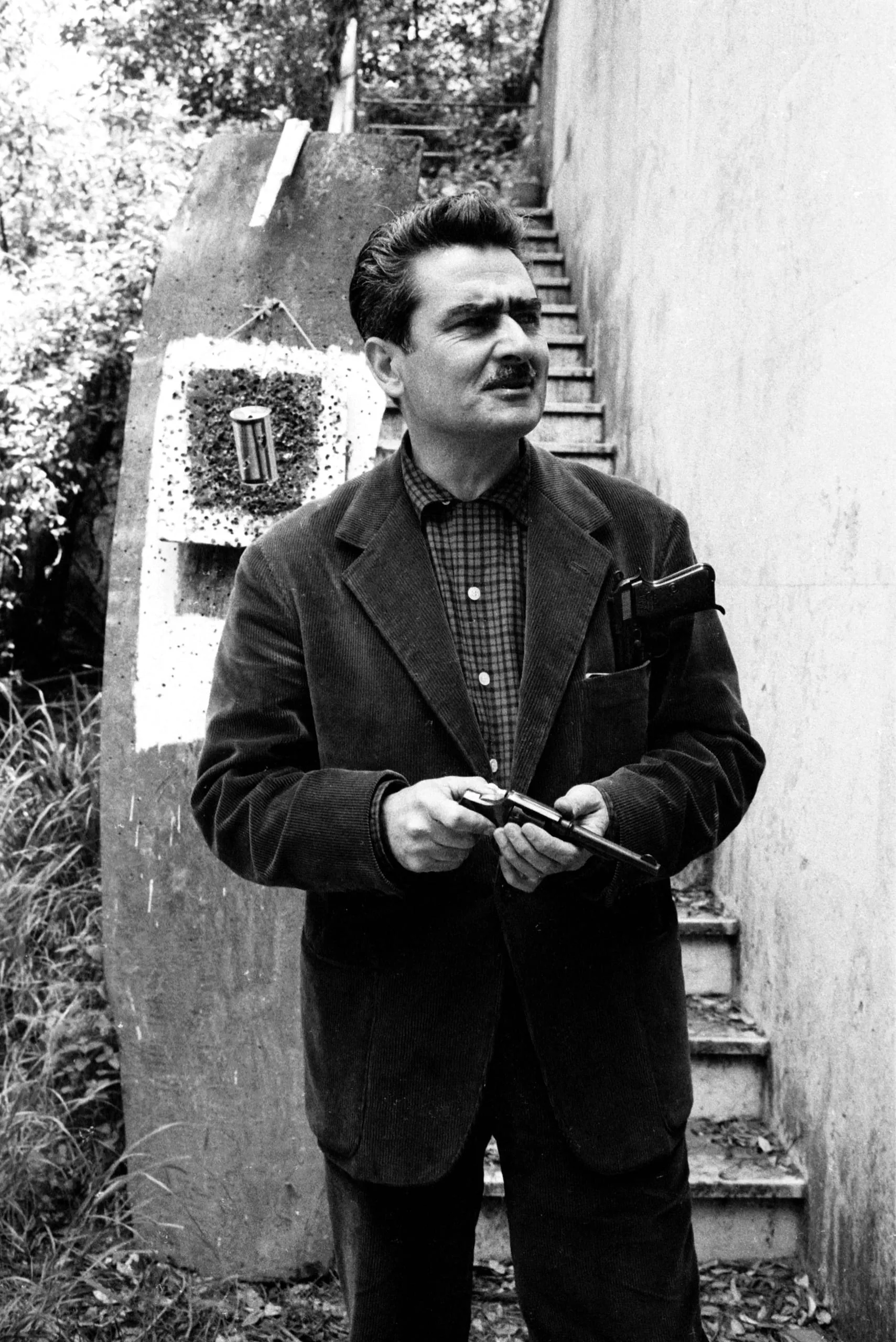 Black and white photograph of a mustachioed man in a dark blazer holding a small object, standing before a curved painted concrete structure outdoors
