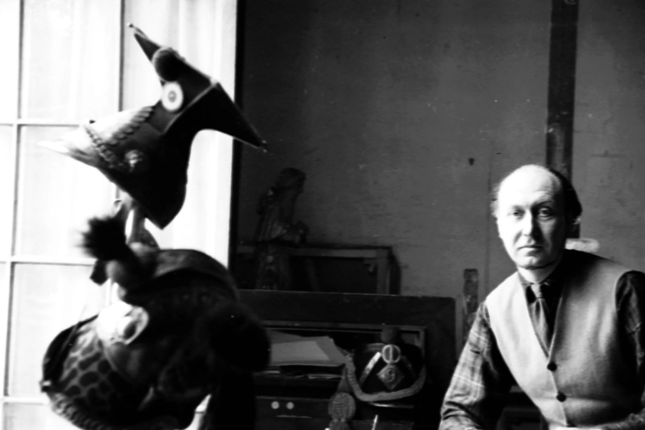 Black and white photograph of a seated white man in a vest and plaid shirt beside a large, dark puppet or costume figure wearing a pointed hat with a circular emblem