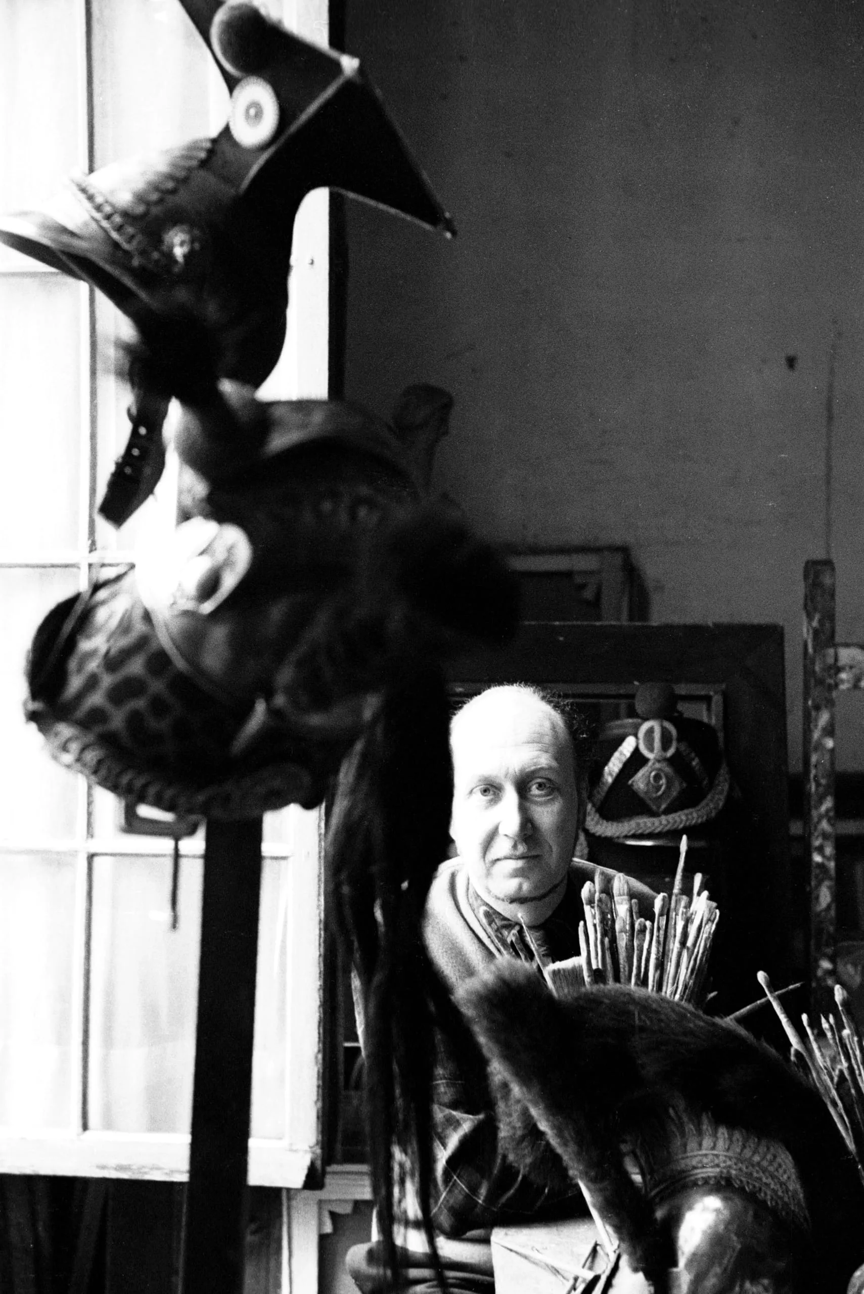 Black and white photograph of a white man with close-cropped gray hair seated in a studio, partially obscured by paintbrushes and a large fantastical bird-like mask or sculpture in the foreground
