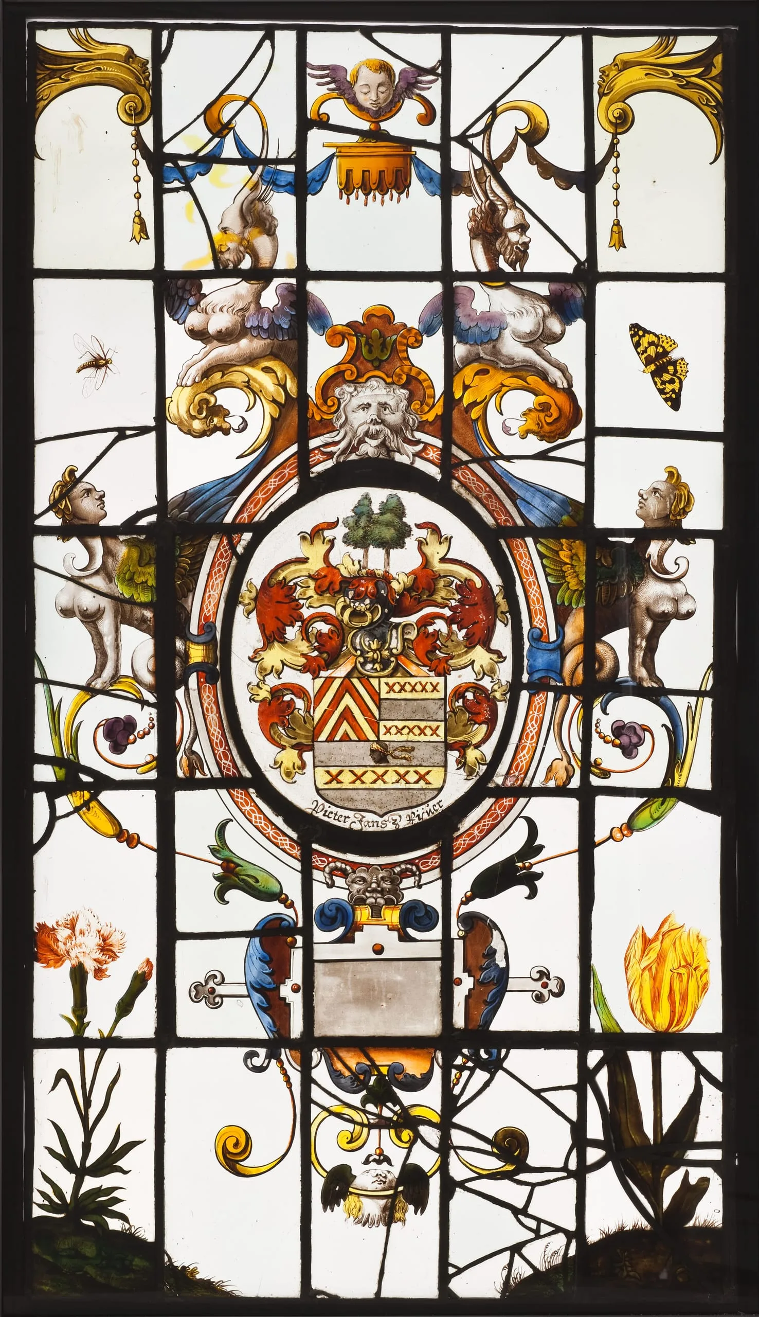 - White glass with silver stain and enamel