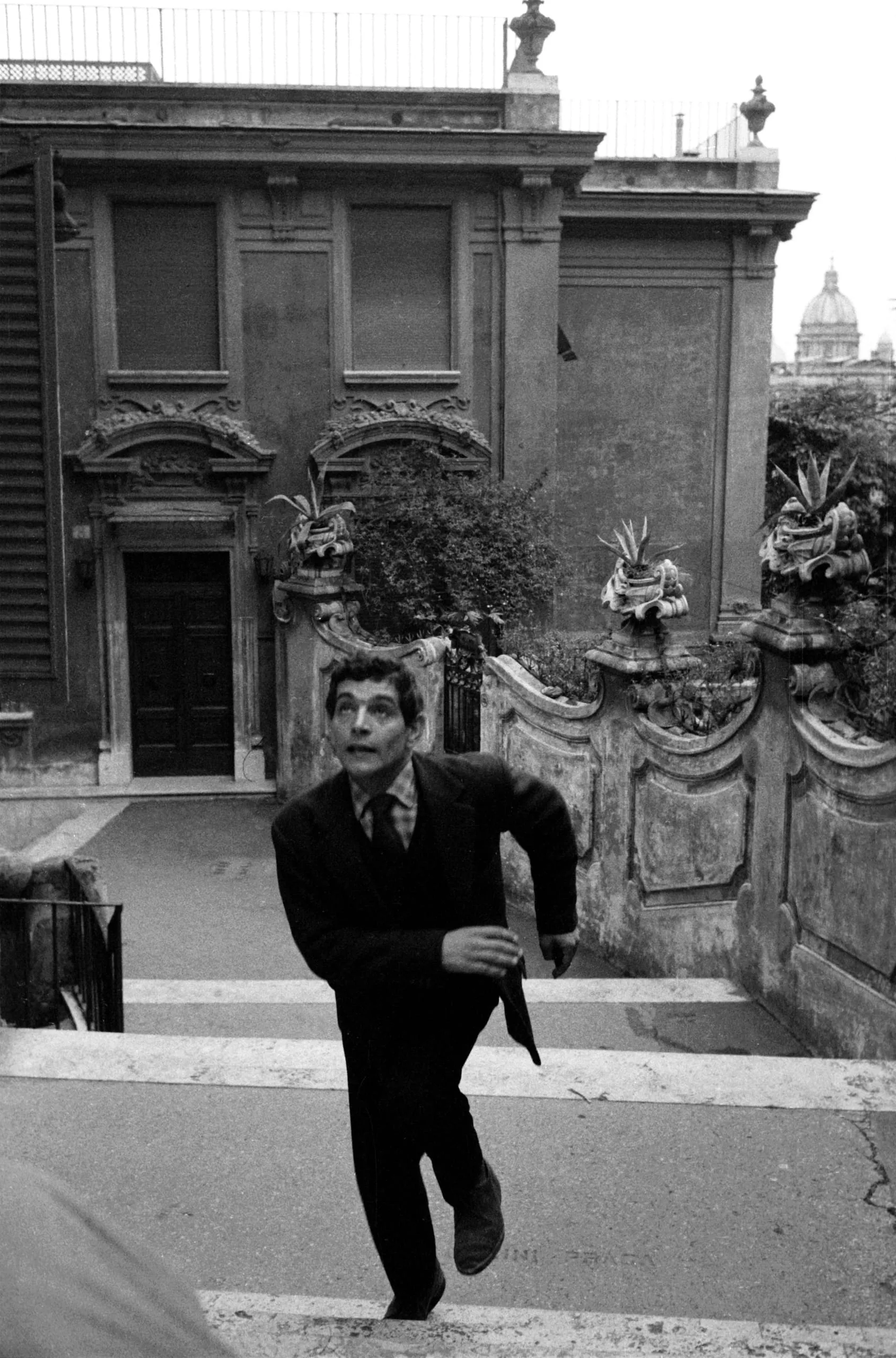 Black and white photograph of a man in a dark suit running up stone steps toward the camera, mouth open, eyes wide, a domed building visible in the distance behind him