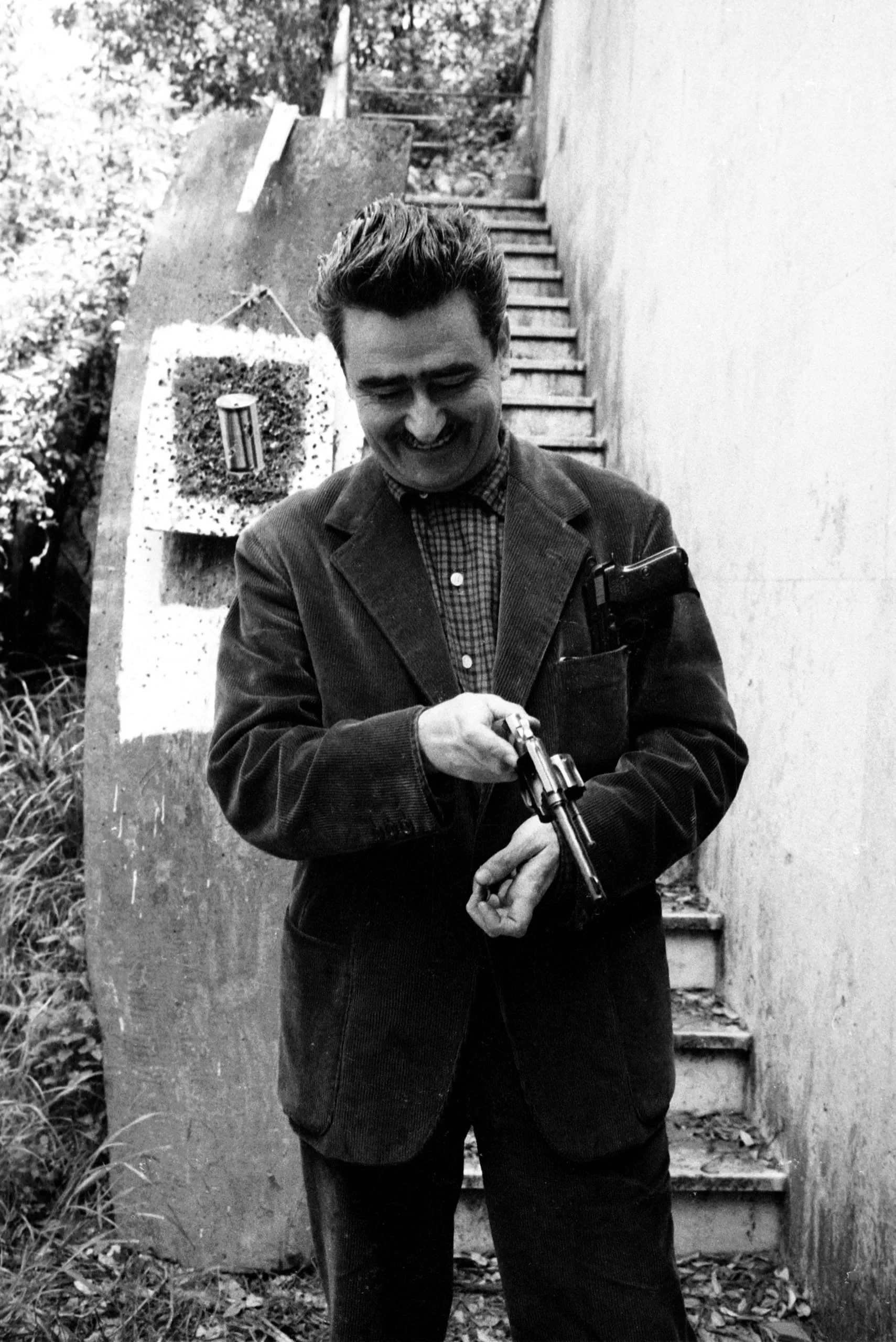 Black and white photograph of a man in a blazer and plaid shirt smiling down at a small revolver held in both hands, standing outdoors near a concrete wall painted with a target