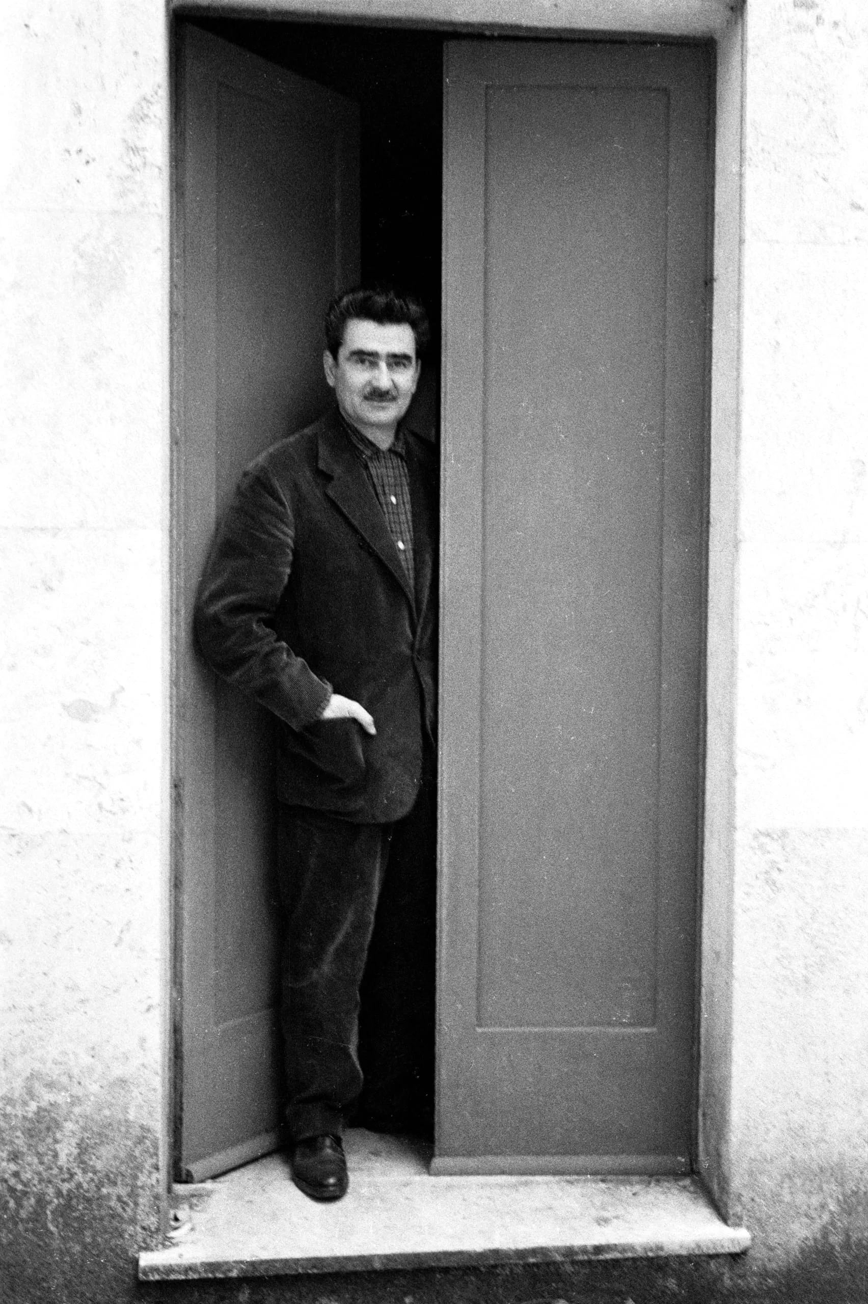 Black and white photograph, full-length portrait of a man in a dark sport coat standing in an open doorway in a pale plaster wall