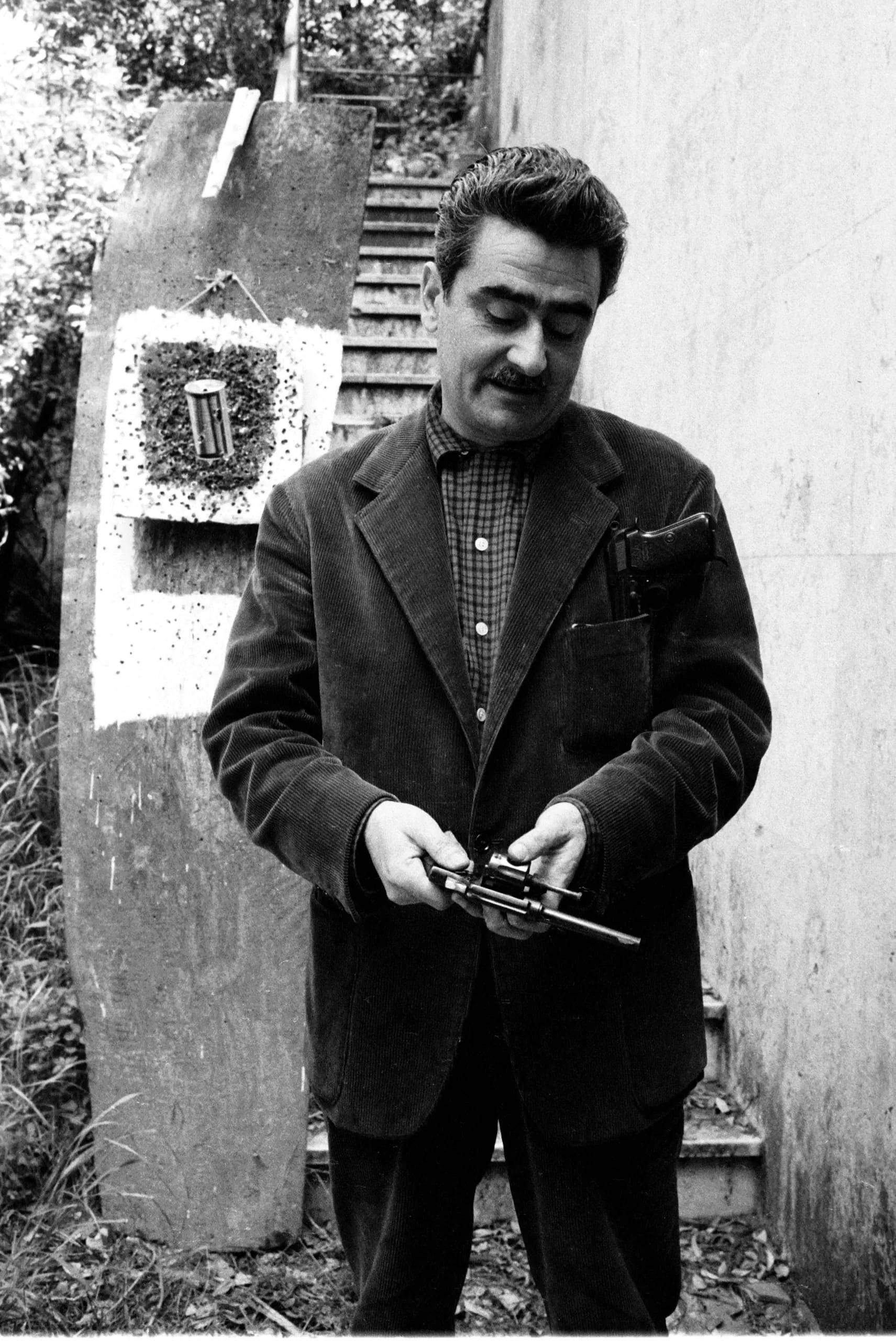 Black and white photograph of a mustachioed man in a corduroy blazer examining a small object in his hands, standing before a large concrete slab with a painted white rectangle